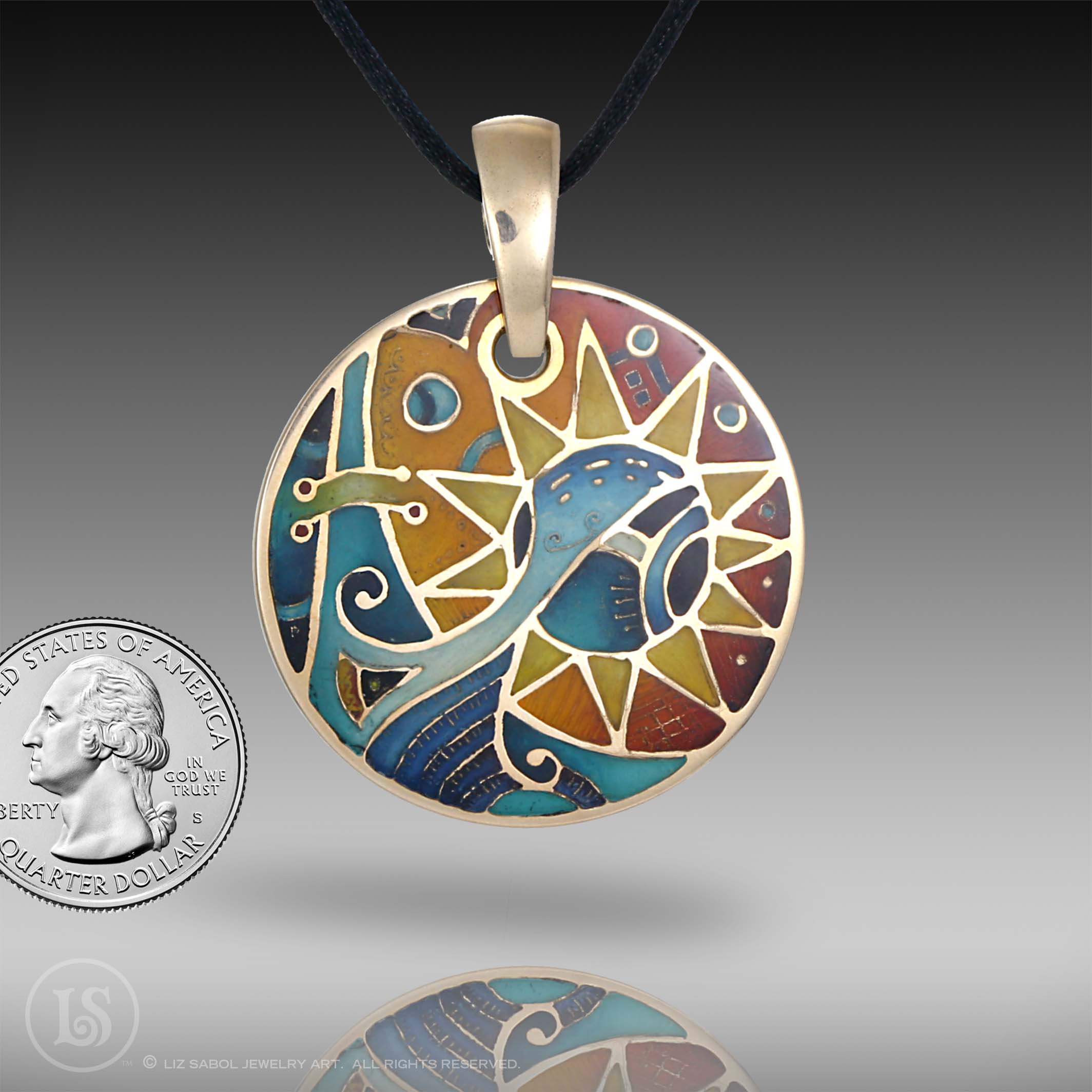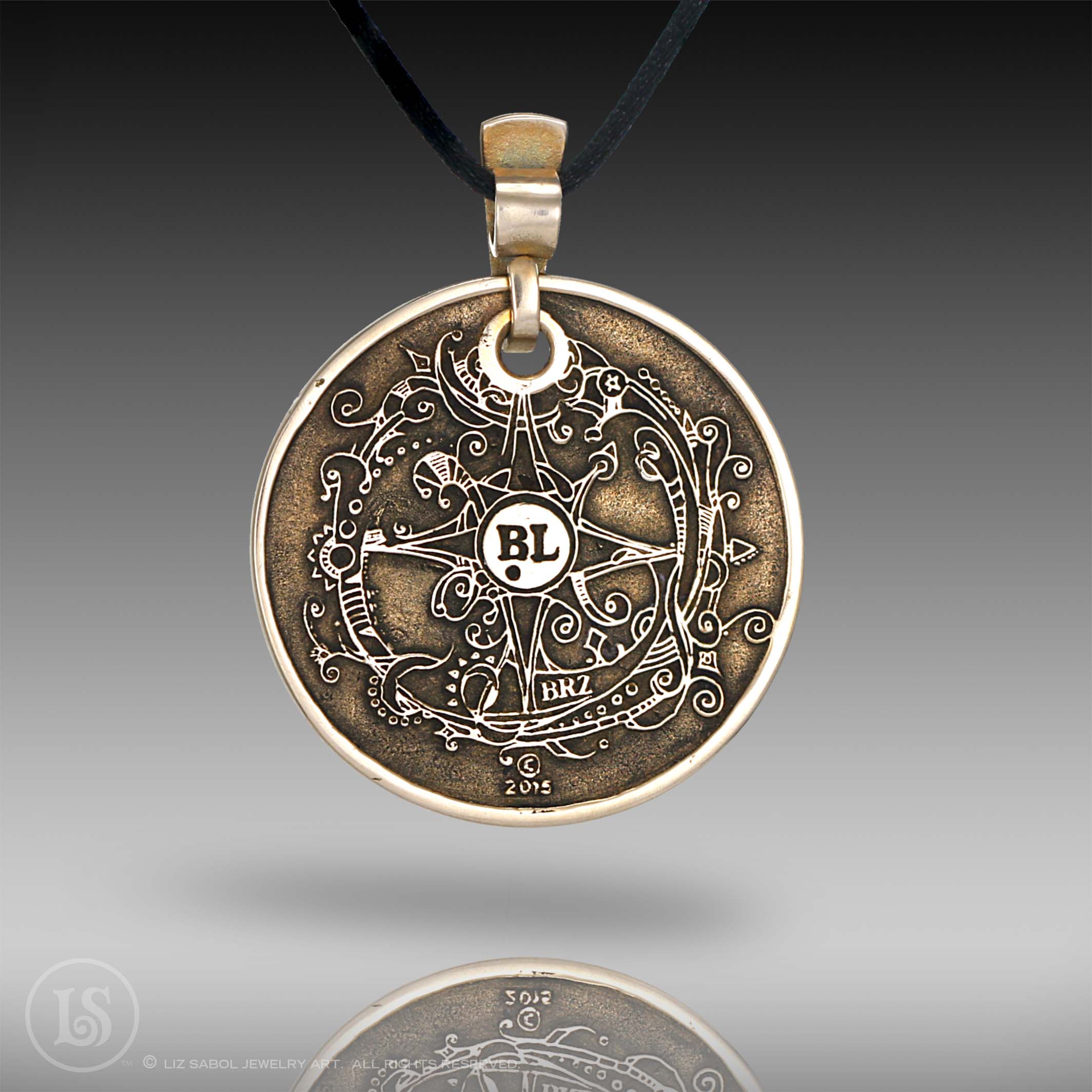 This bronze pendant is hand-crafted in bronze metal clay, hand-painted and filled with resin.  The resin is sanded flush and re-polished.