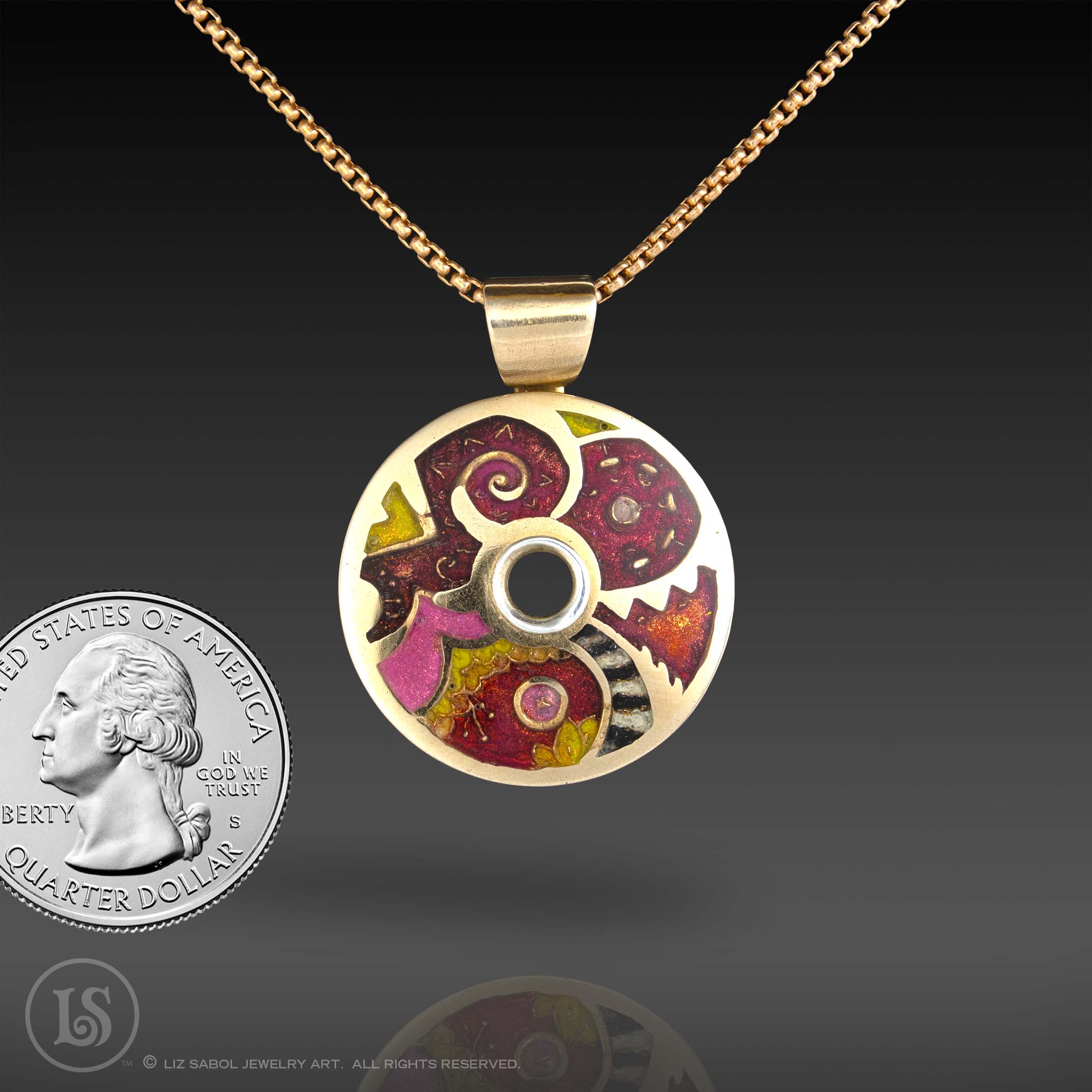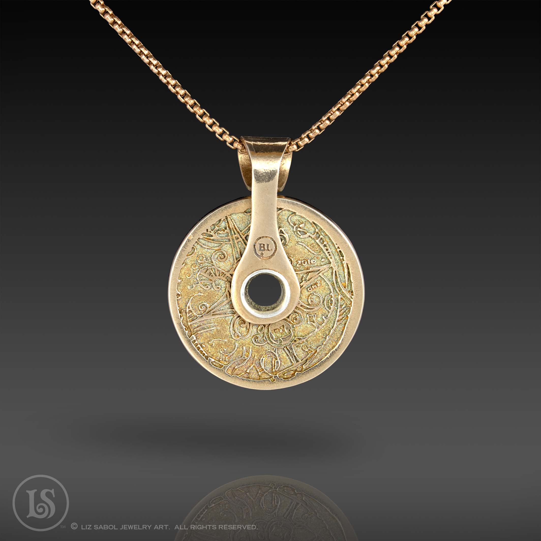 This pendant is hand-crafted in bronze metal clay, hand-painted and filled with resin.  The resin is sanded flush and re-polished.