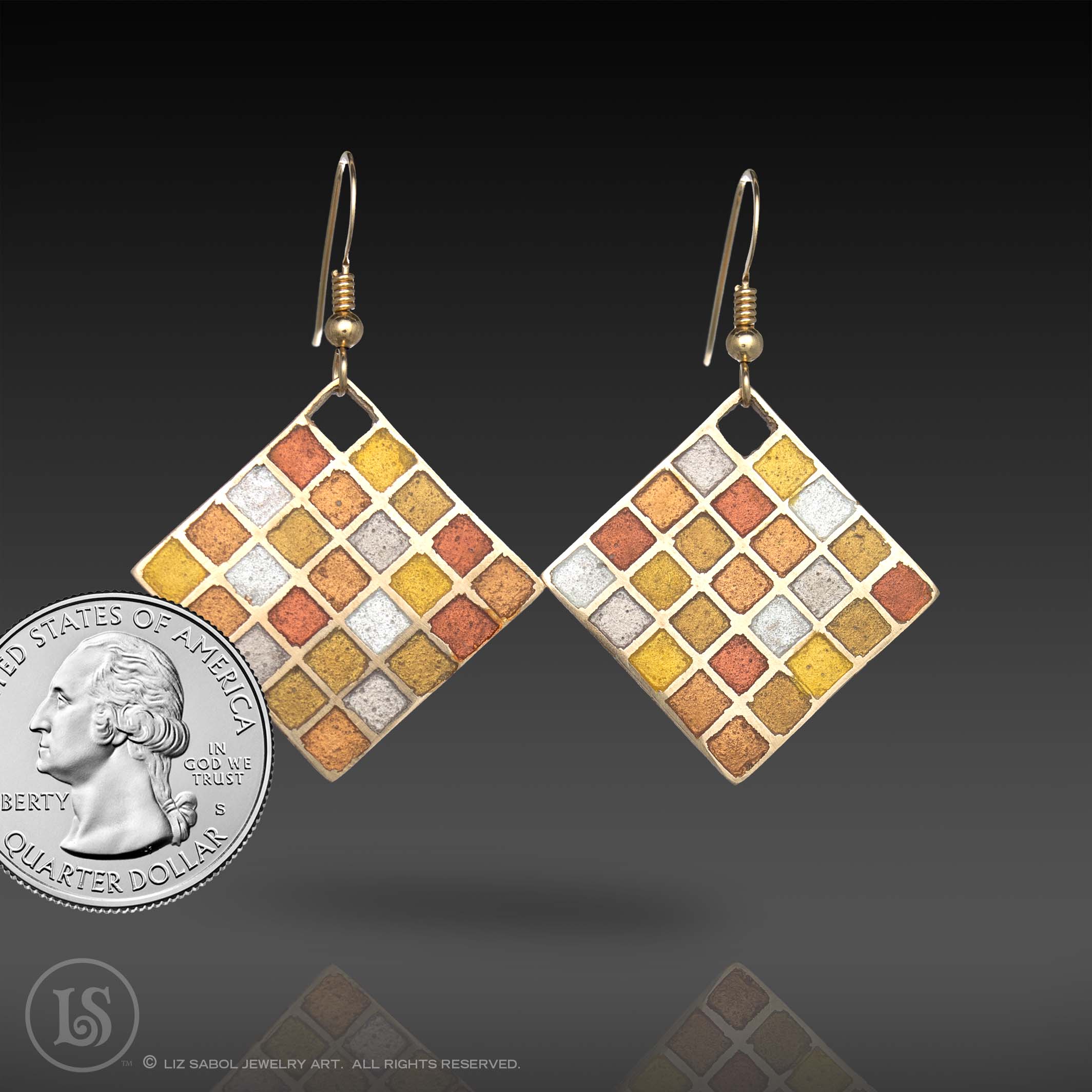 These earrings are hand-crafted in bronze metal clay, hand-painted and filled with resin. The resin is sanded flush and re-polished.