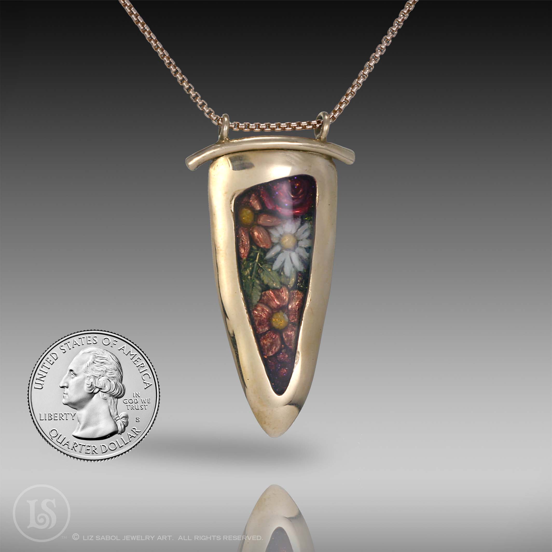 This bronze pendant is hand-crafted in bronze metal clay, hand-painted and filled with resin.  The resin is sanded flush and re-polished.