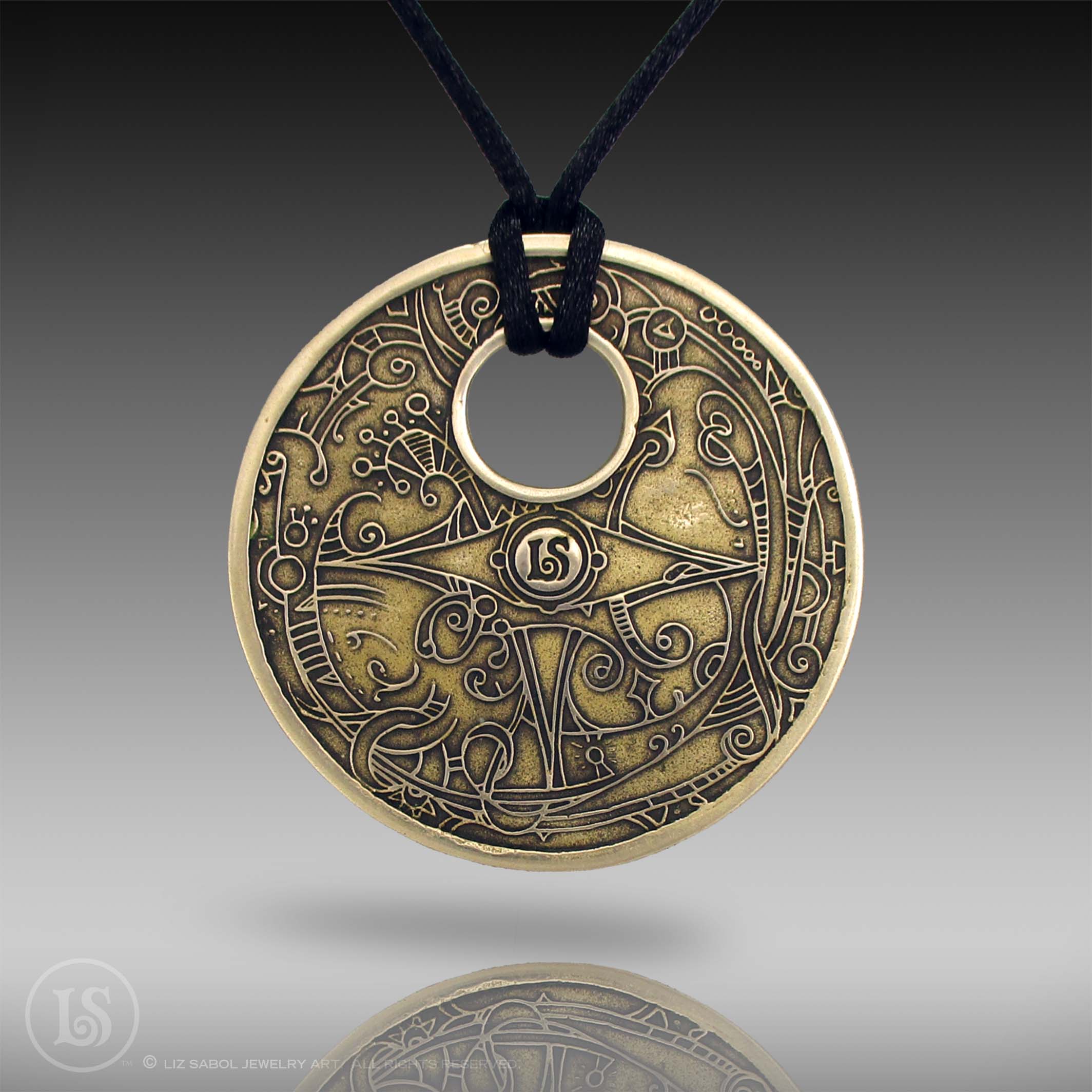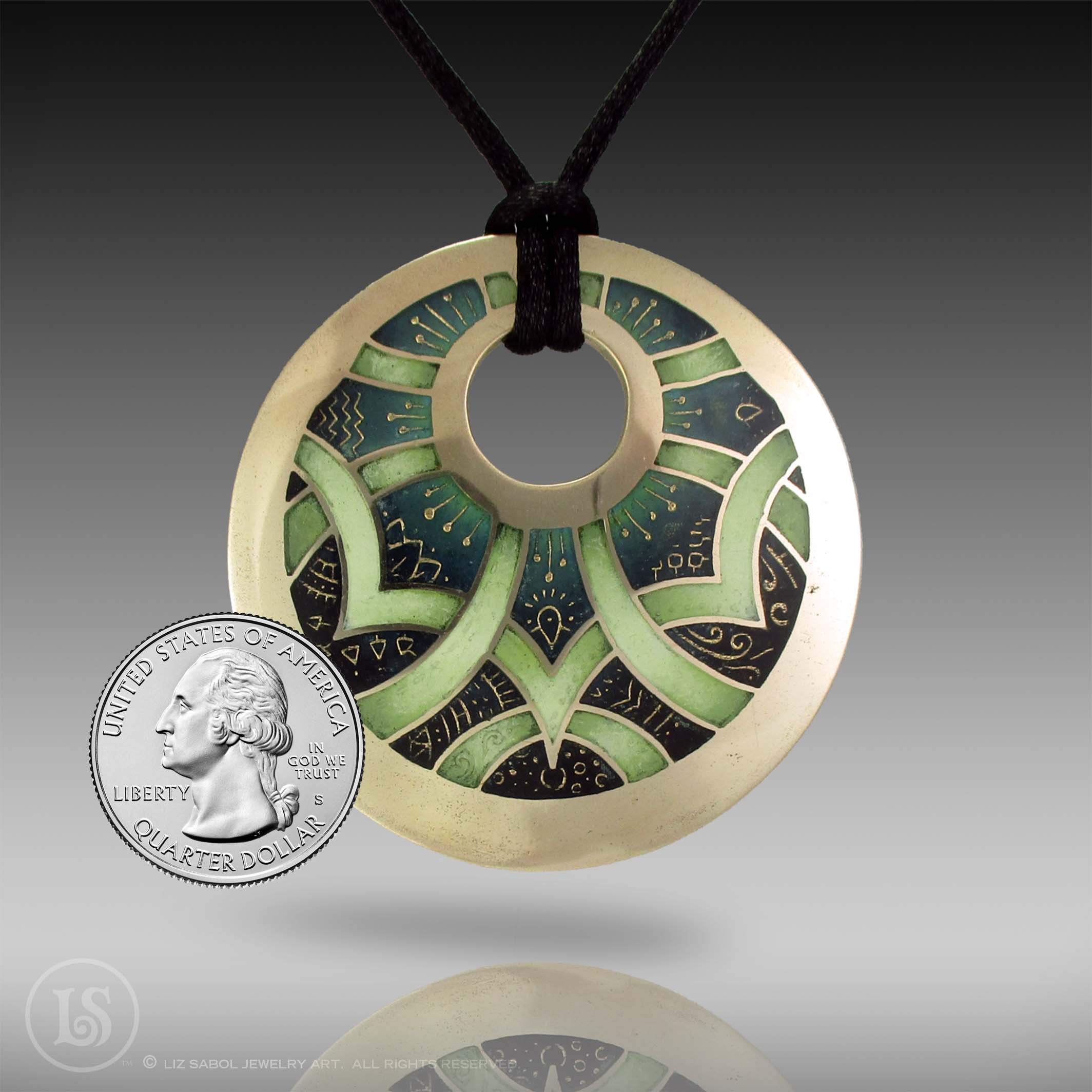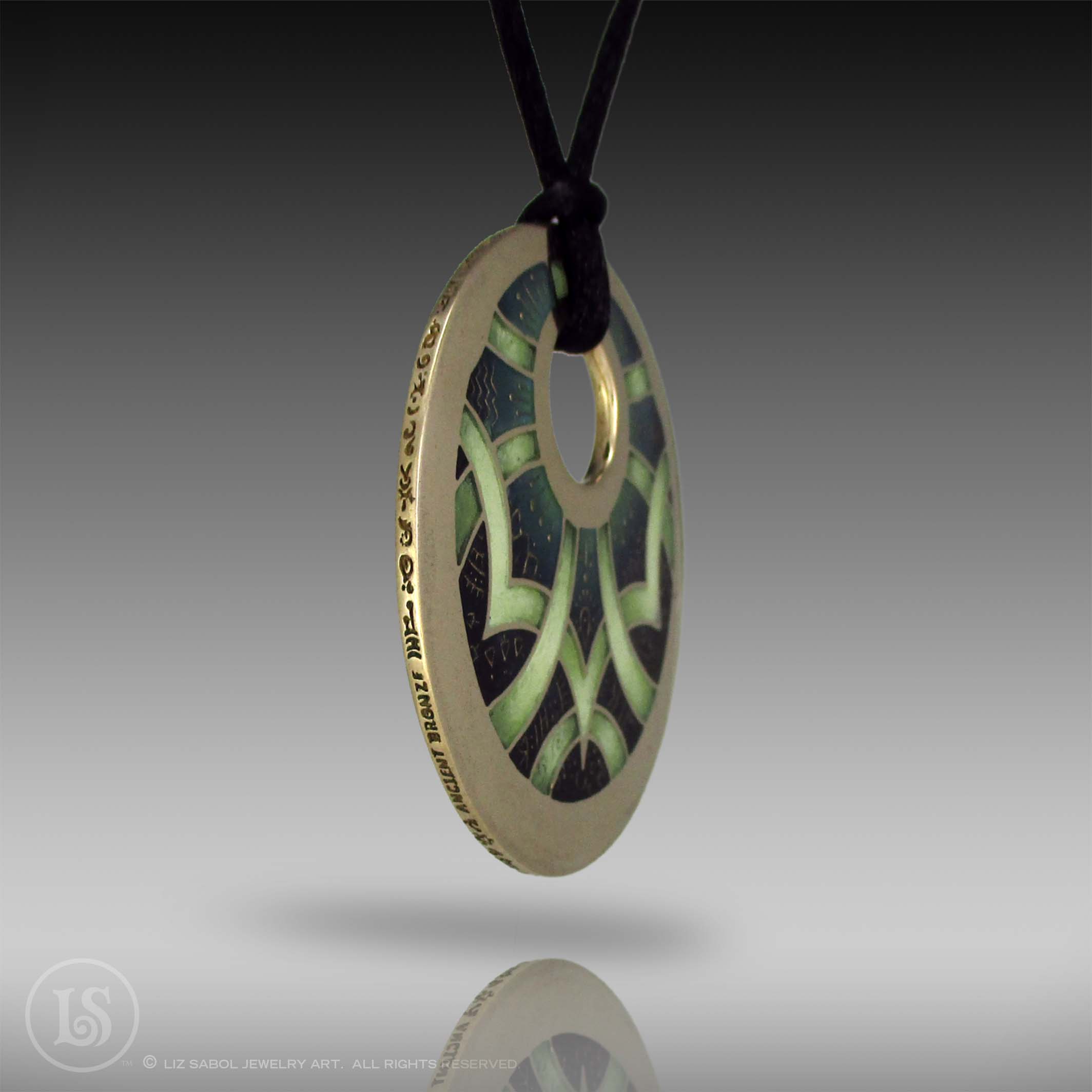 This pendant is part of my Dreamweaver collection.  This pendant is hand-crafted in bronze metal clay, hand-painted and filled with resin.  The resin is sanded flush and re-polished.  Runes decorate the outer edge.