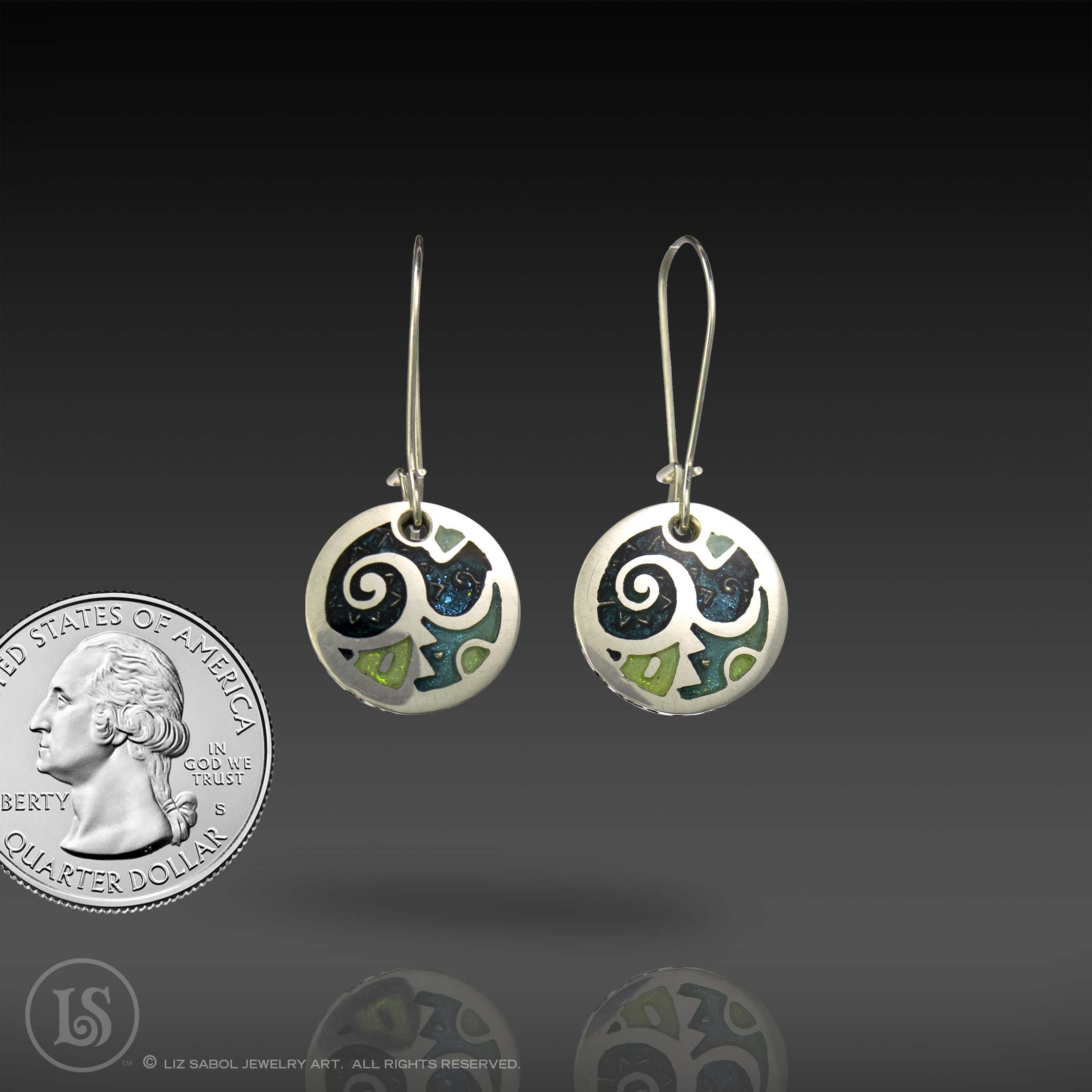 These earrings are hand-crafted in 960 sterling silver metal clay, hand-painted and filled with resin. The resin is sanded flush and re-polished.