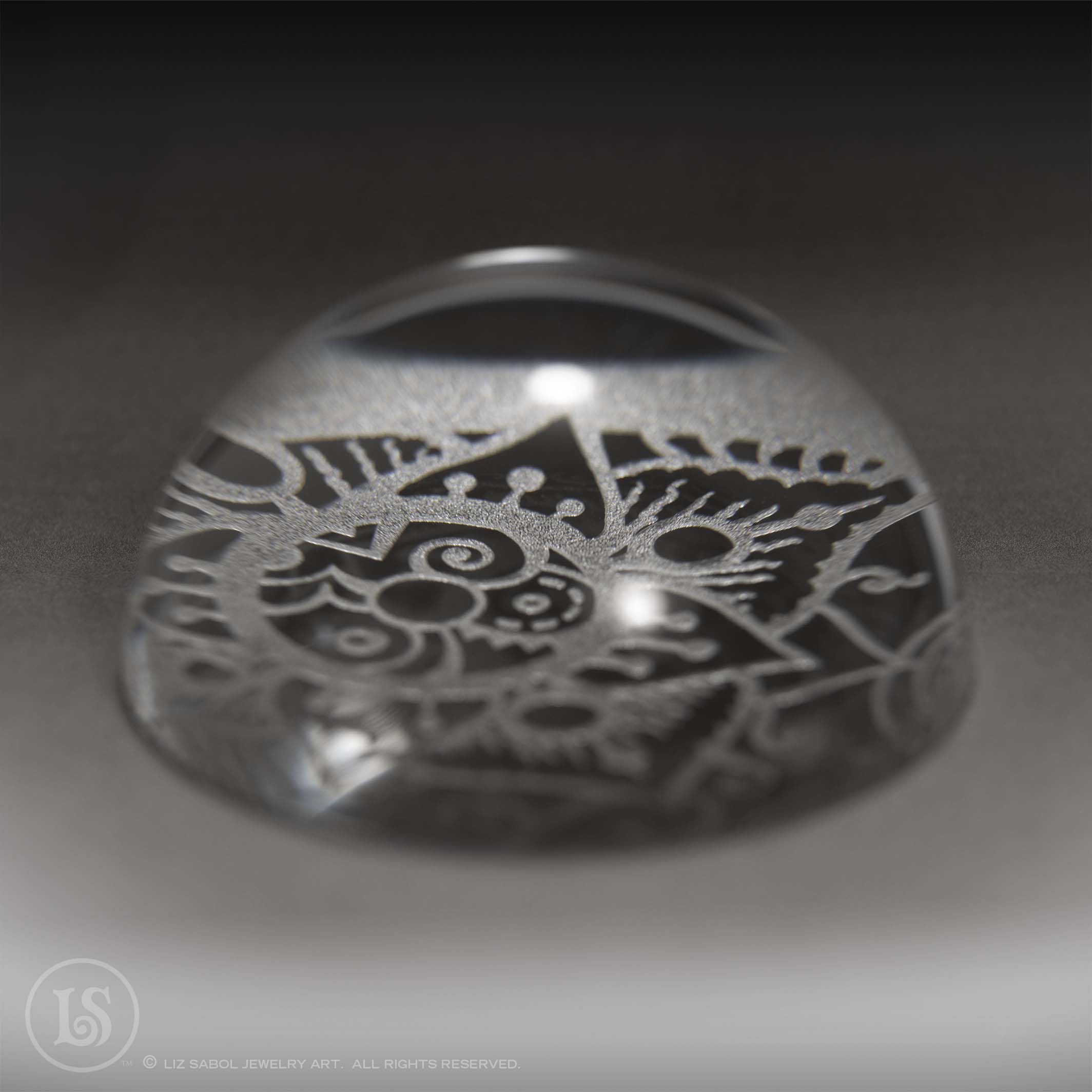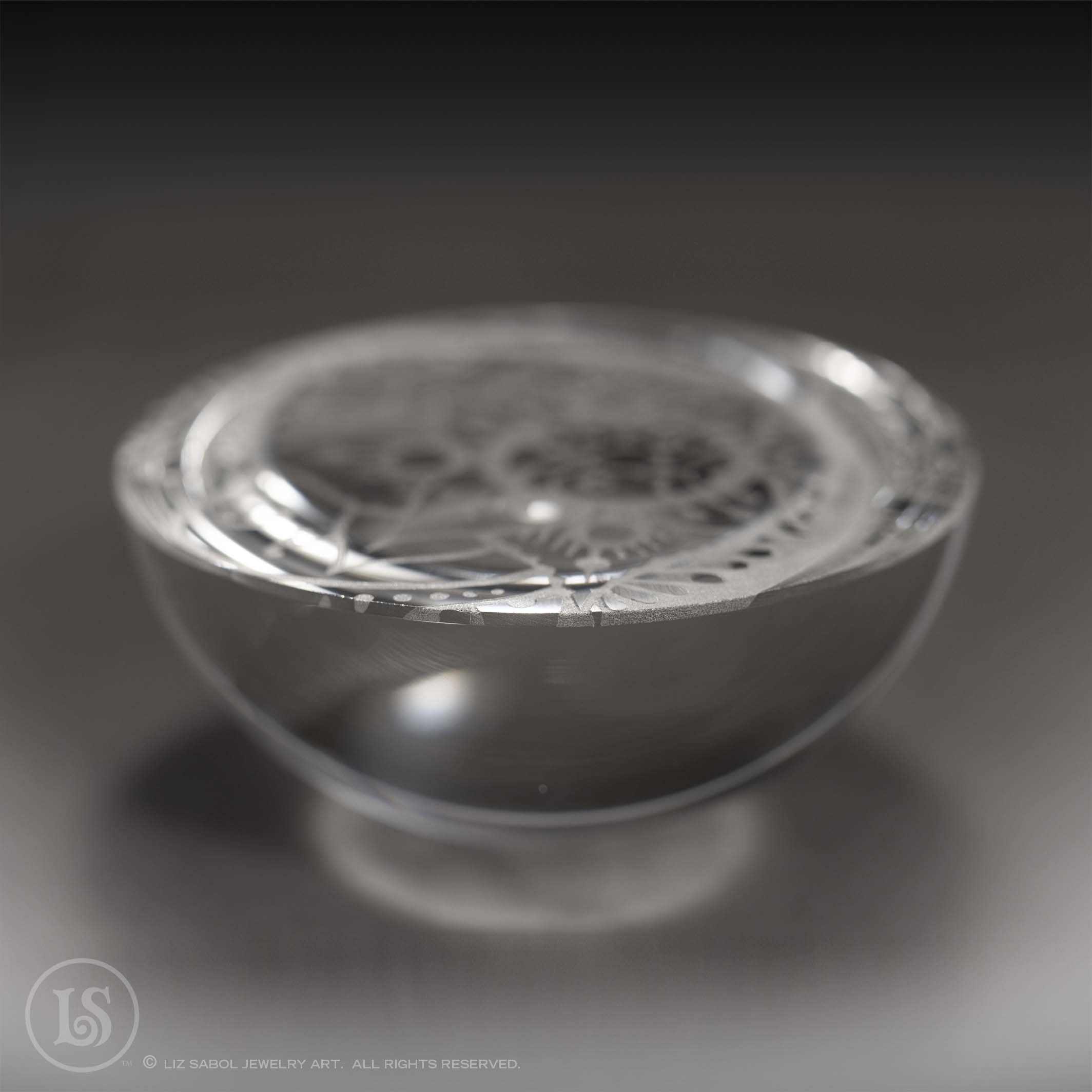 Crystal clear domed glass paperweight. Etched on the bottom with a section of my Passion flower design.