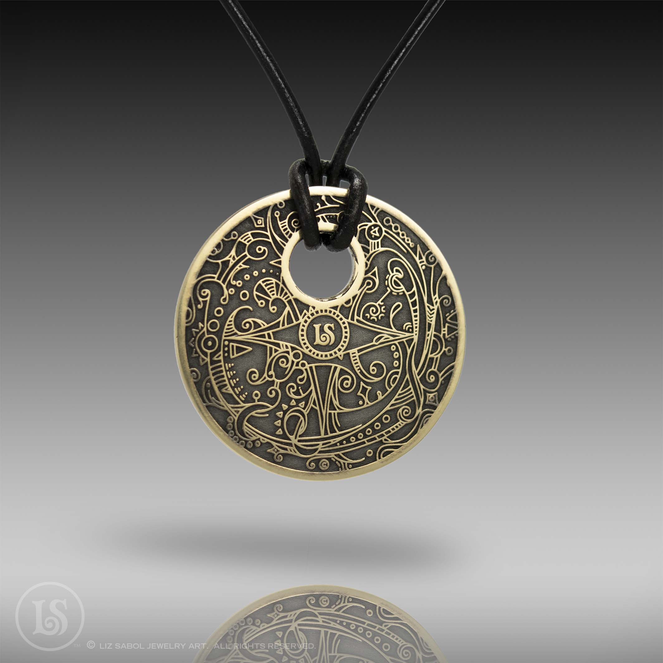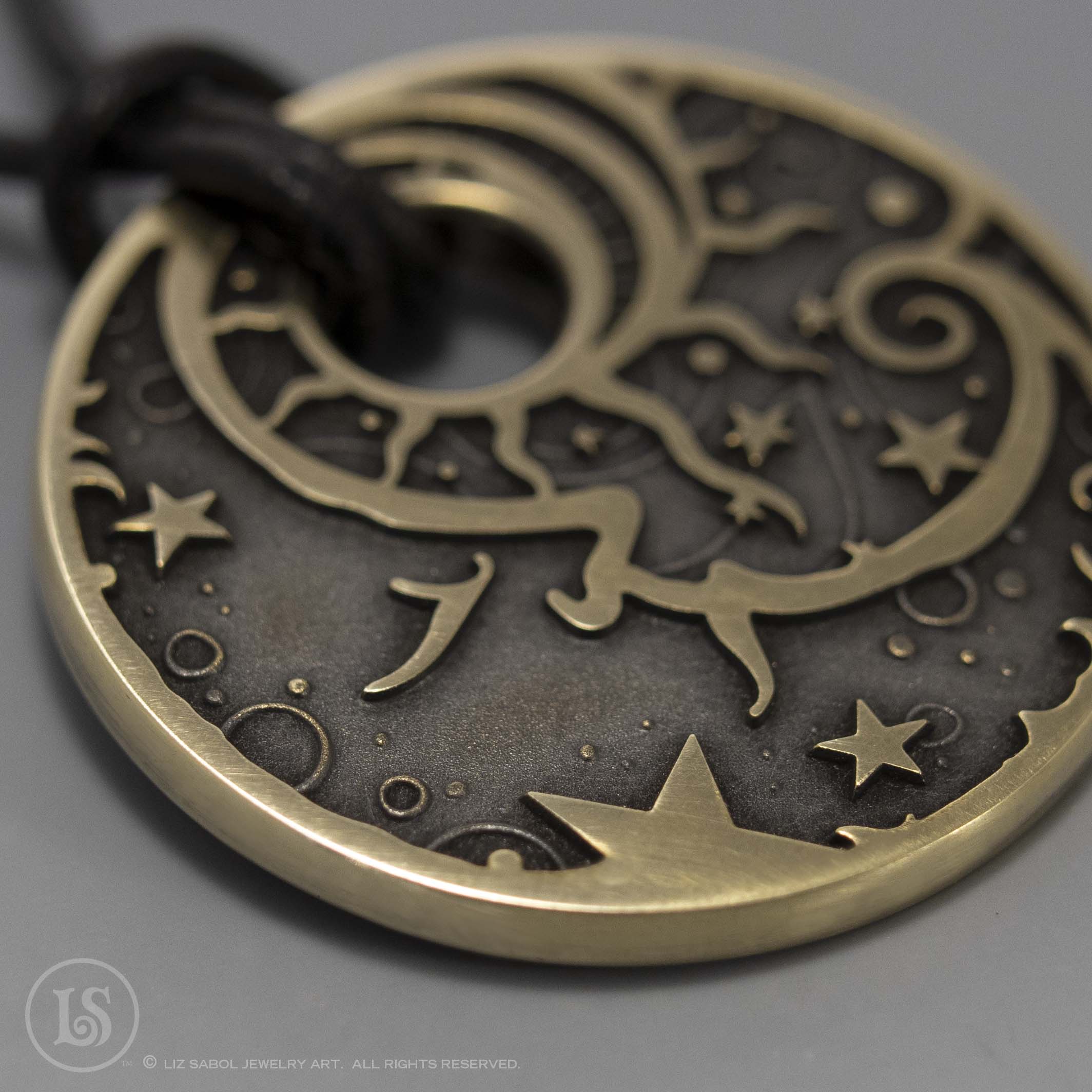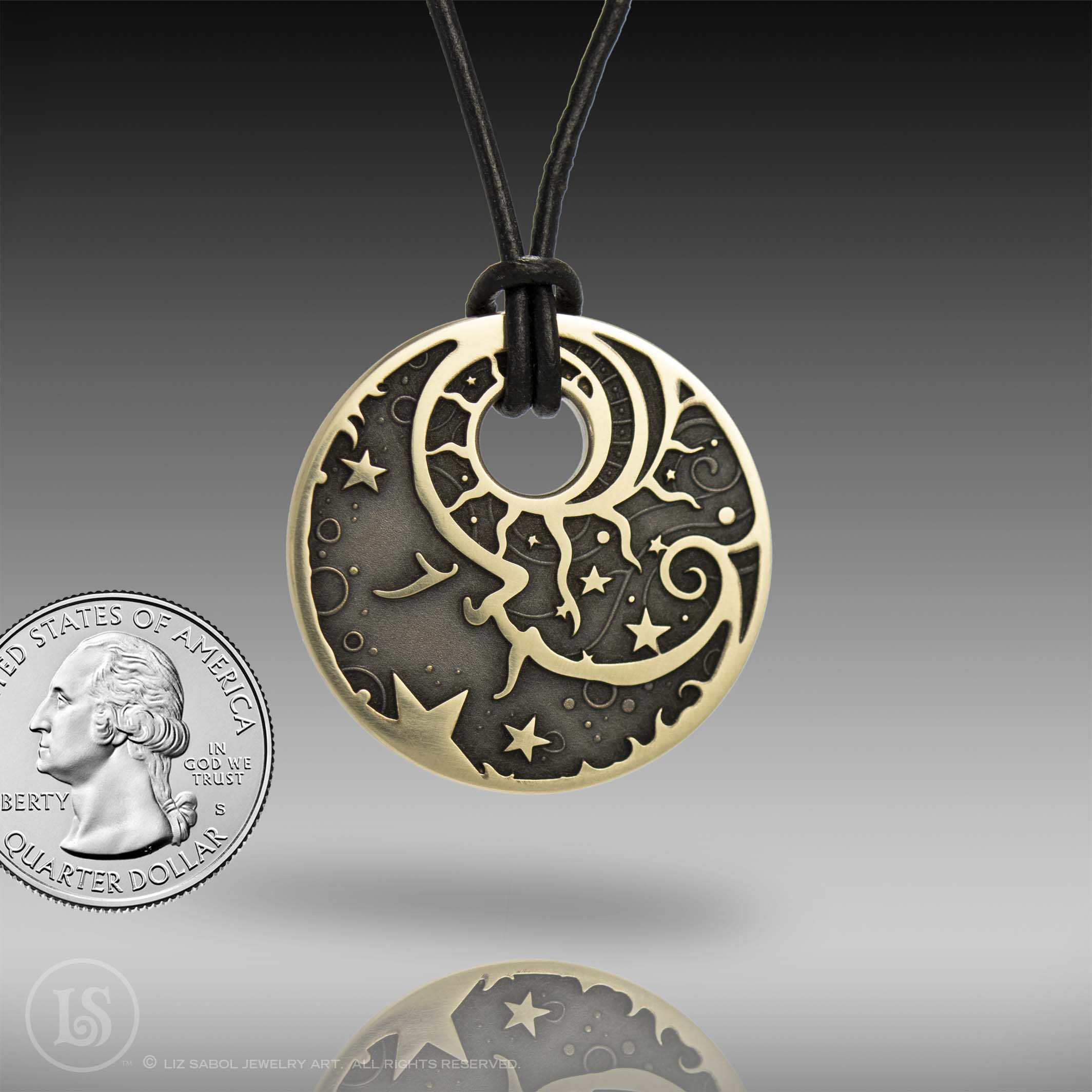 Solid brass pendant with my Celestial Man in the Moon design in deep relief. Patina applied for contrast. 18" Leather cord included. This is un-sealed brass, and will tarnish over time. Polishing cloth is included. Cleaning this pendant in any chemical cleaning liquid will remove the patina.