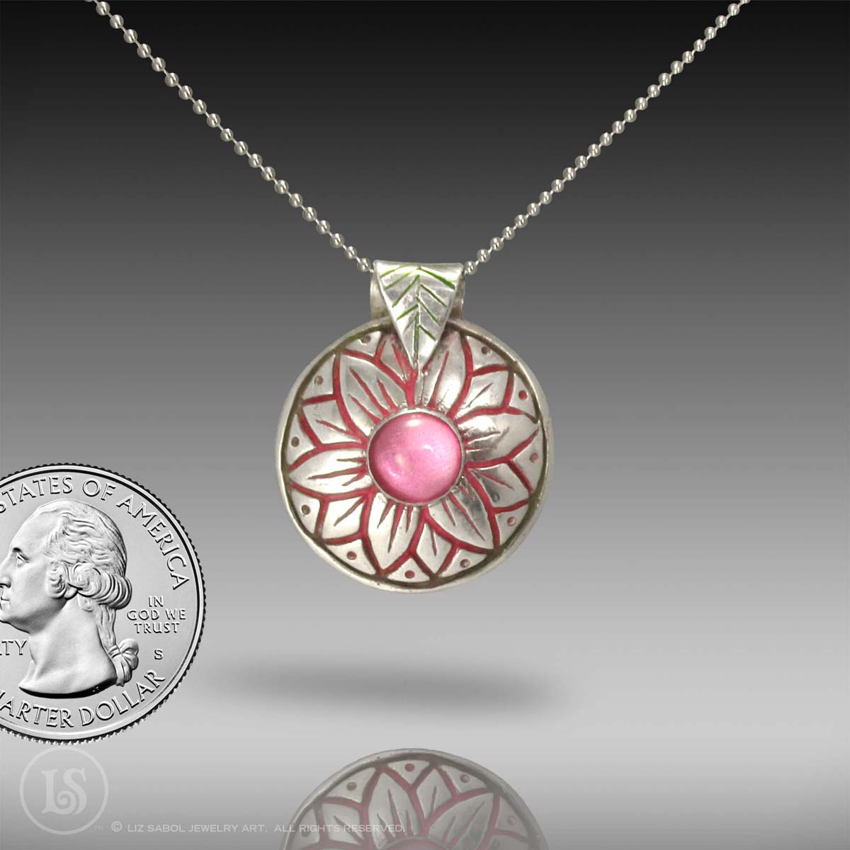 This pendant is hand-crafted in 999 fine silver metal clay. The details, created from a hand-carved wax mold are highlighted with oil paint.