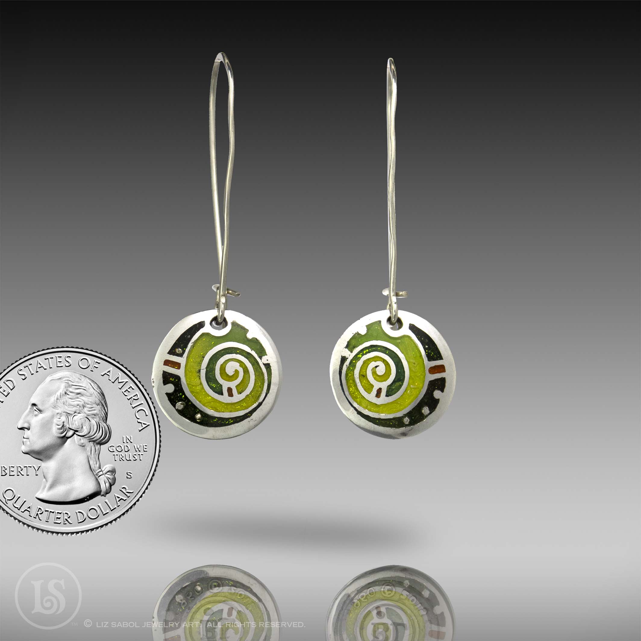 These earrings are hand-crafted in 960 sterling silver metal clay, hand-painted and filled with resin. The resin is sanded flush and re-polished.