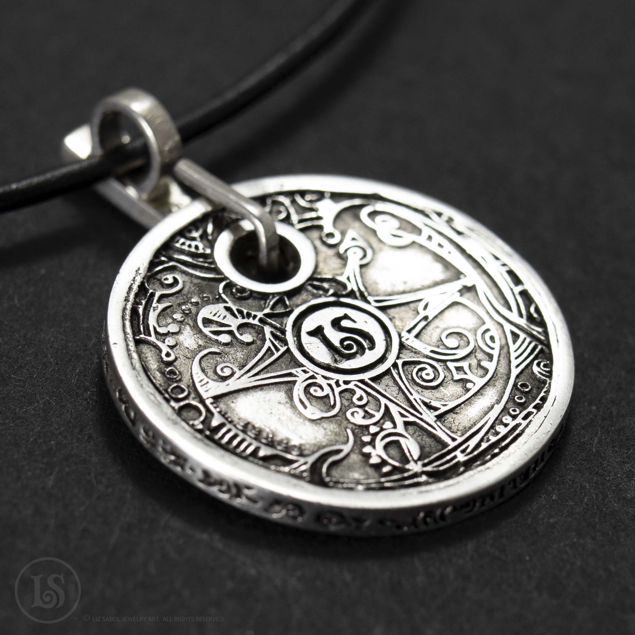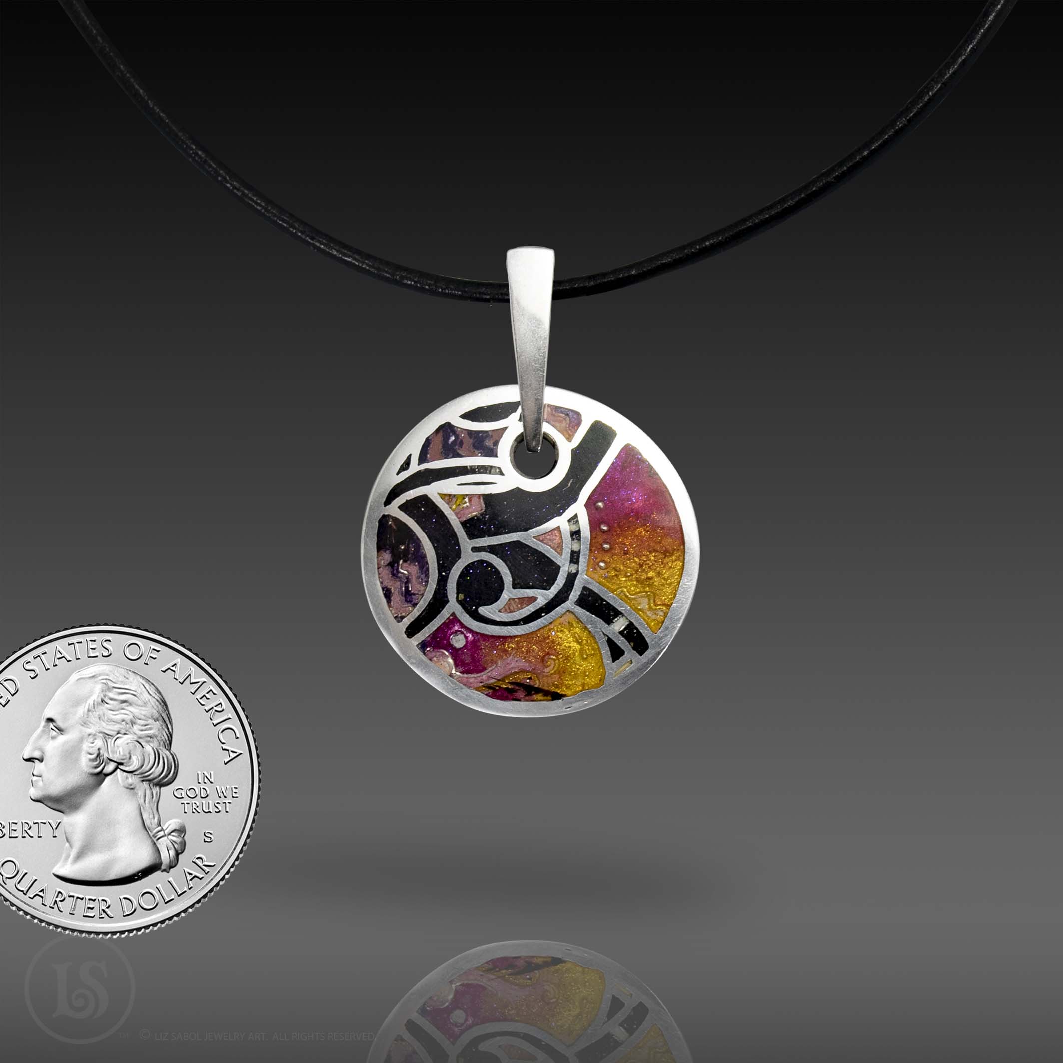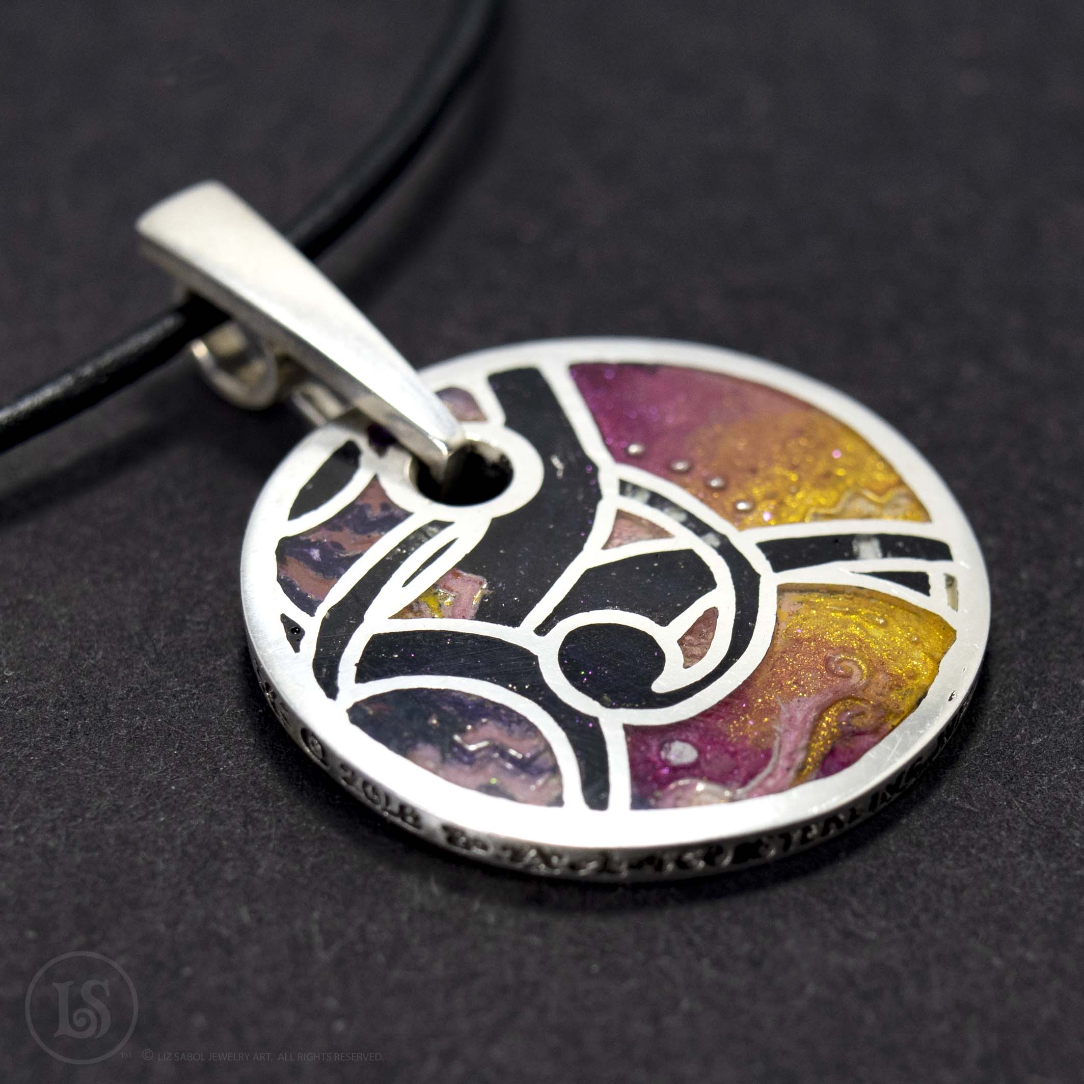 Hand-made, one of a kind, hand-painted cold-enamel champleve. 960 sterling silver metal clay. Resin. Edge is decorated with symbols. Chain not included. Bail fits cords/chains up to 3mm.