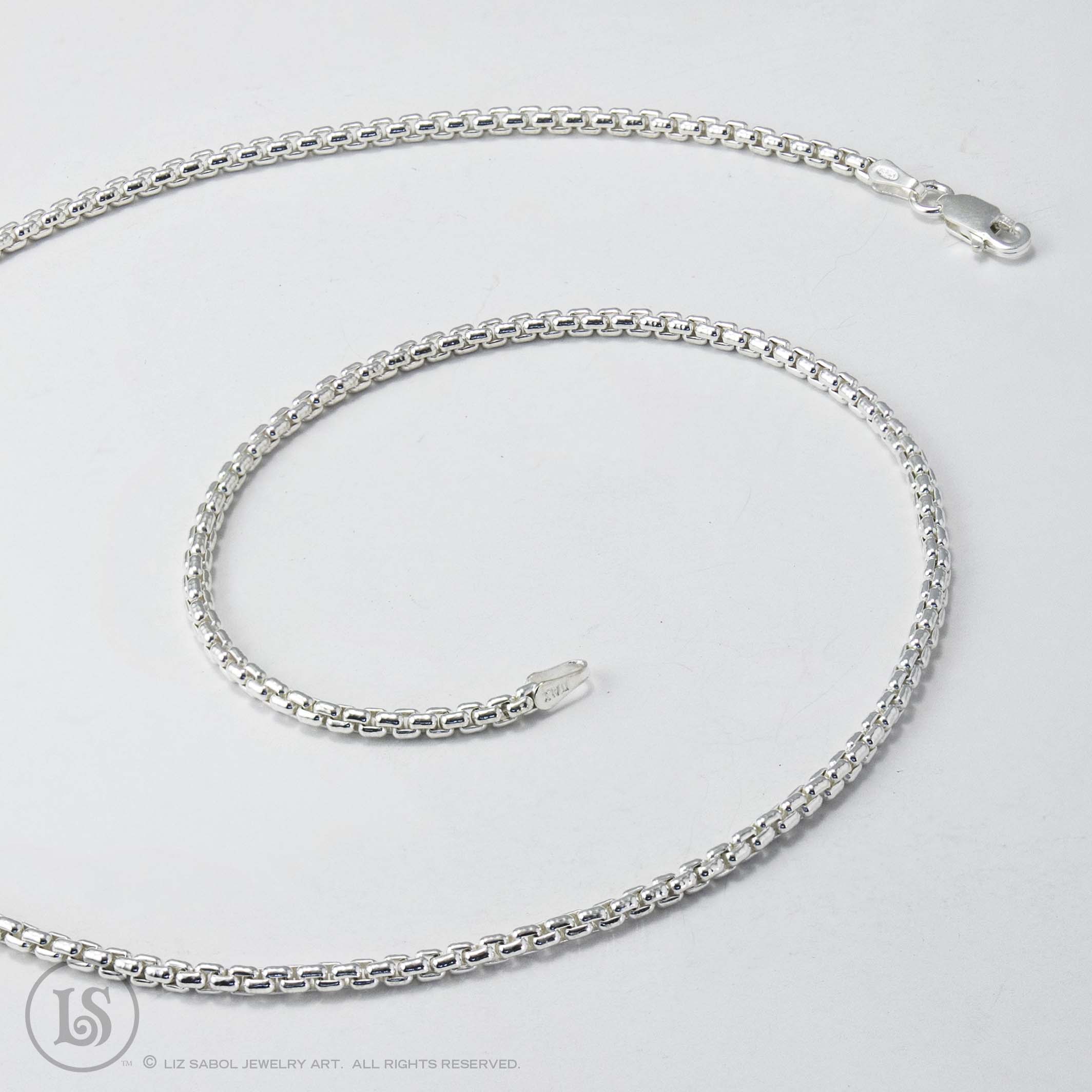 Rounded box chain, sterling silver. 2.5mm wide. 18 Inches long. Slim end allows the chain to fit through smaller bails than standard ring ends. Pendant NOT included, shown for example only.