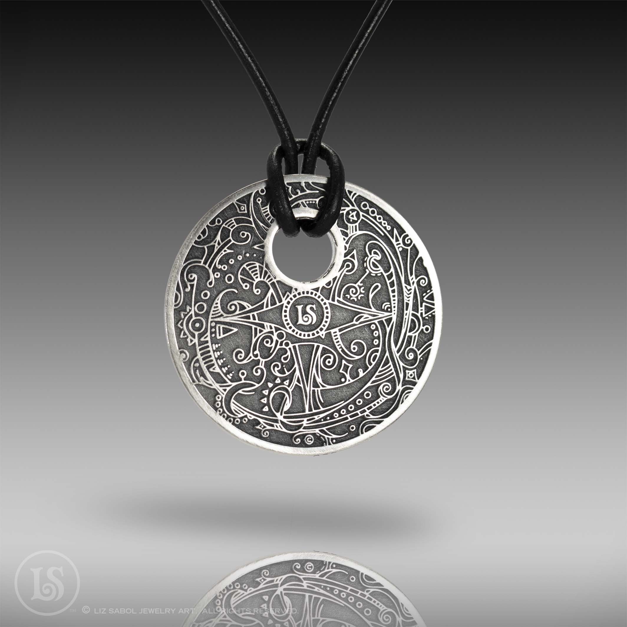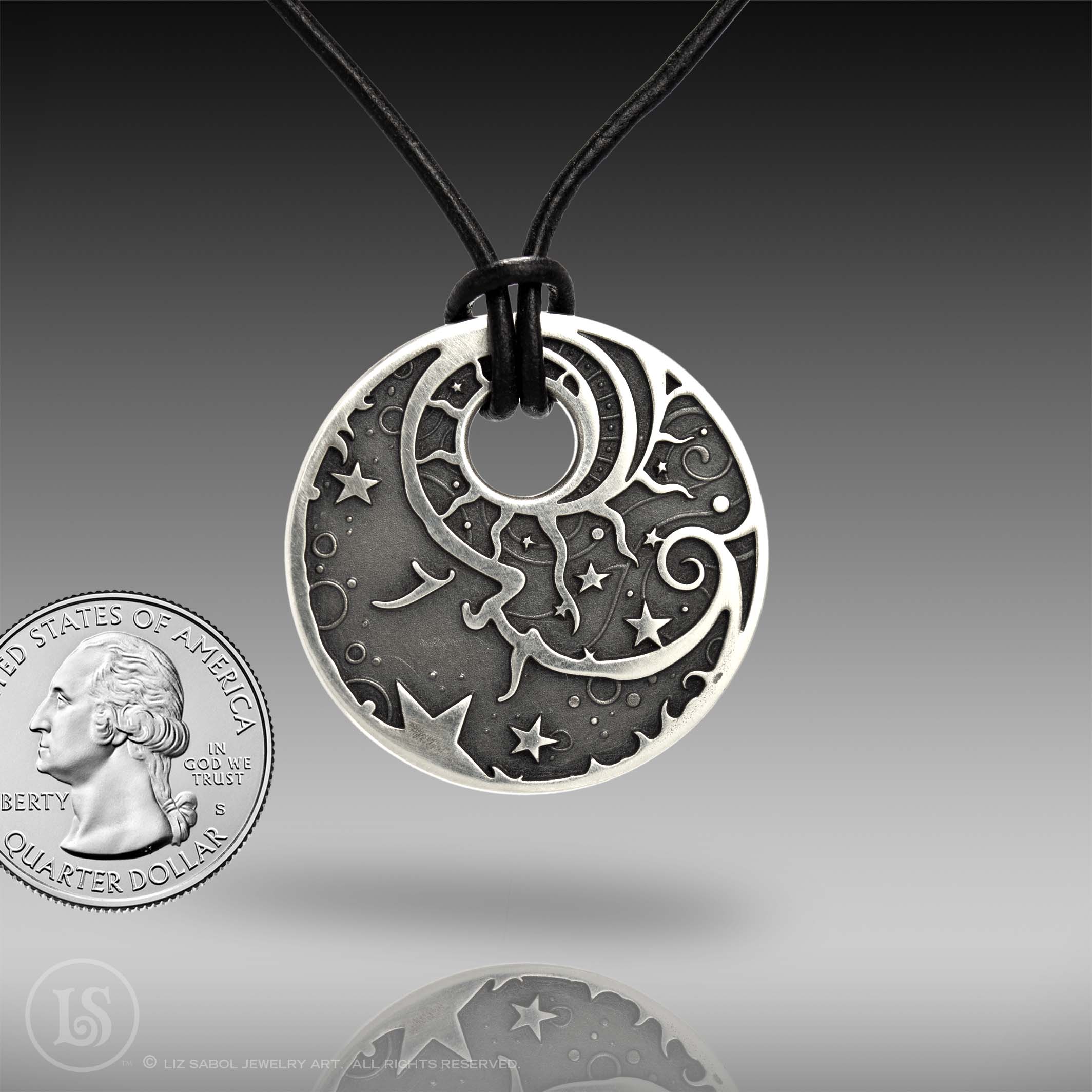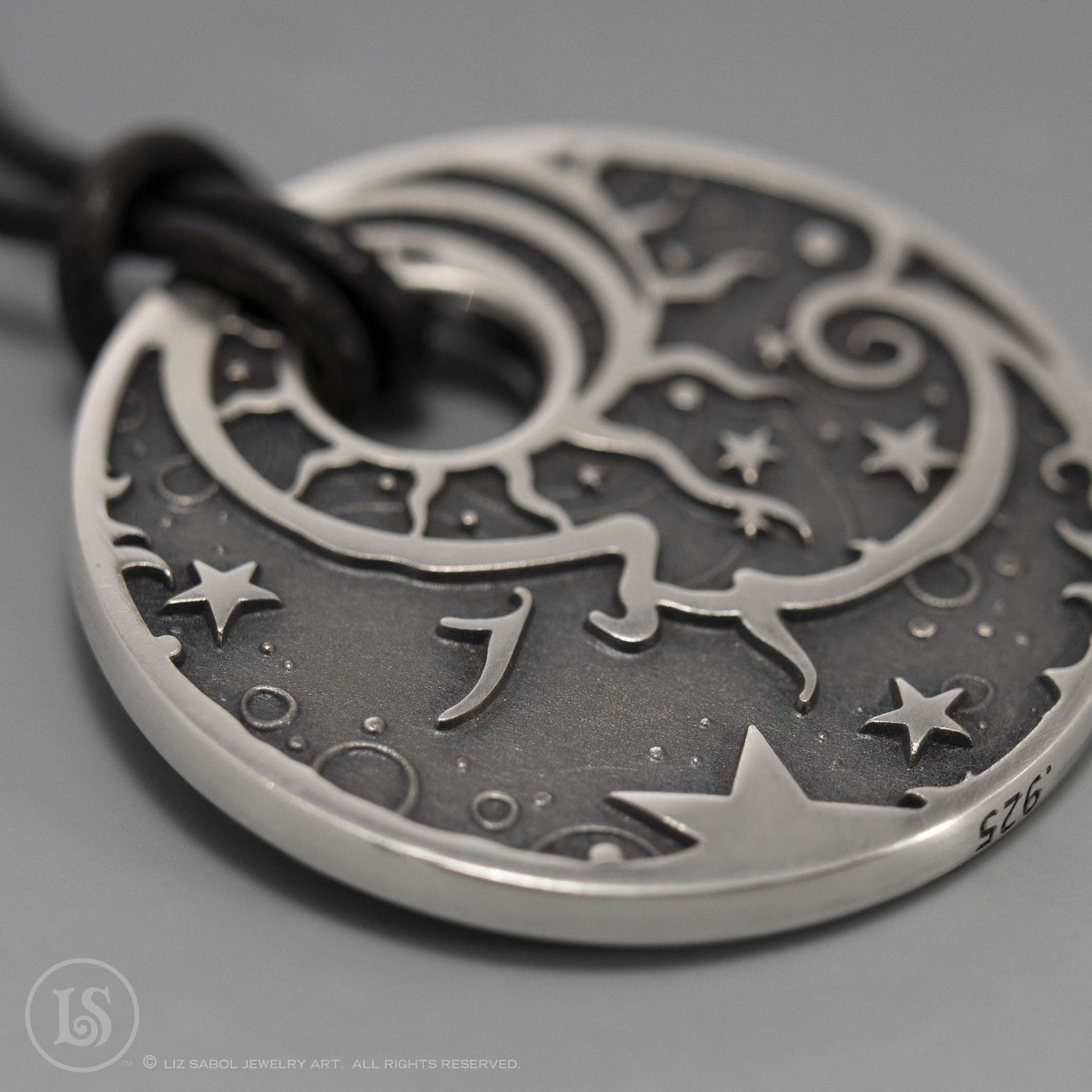 Solid sterling silver pendant with my Celestial Man in the Moon design in deep relief. Patina applied for contrast. 18" Leather cord included. Polishing cloth included. Cleaning this pendant in any chemical cleaning liquid will remove the patina.