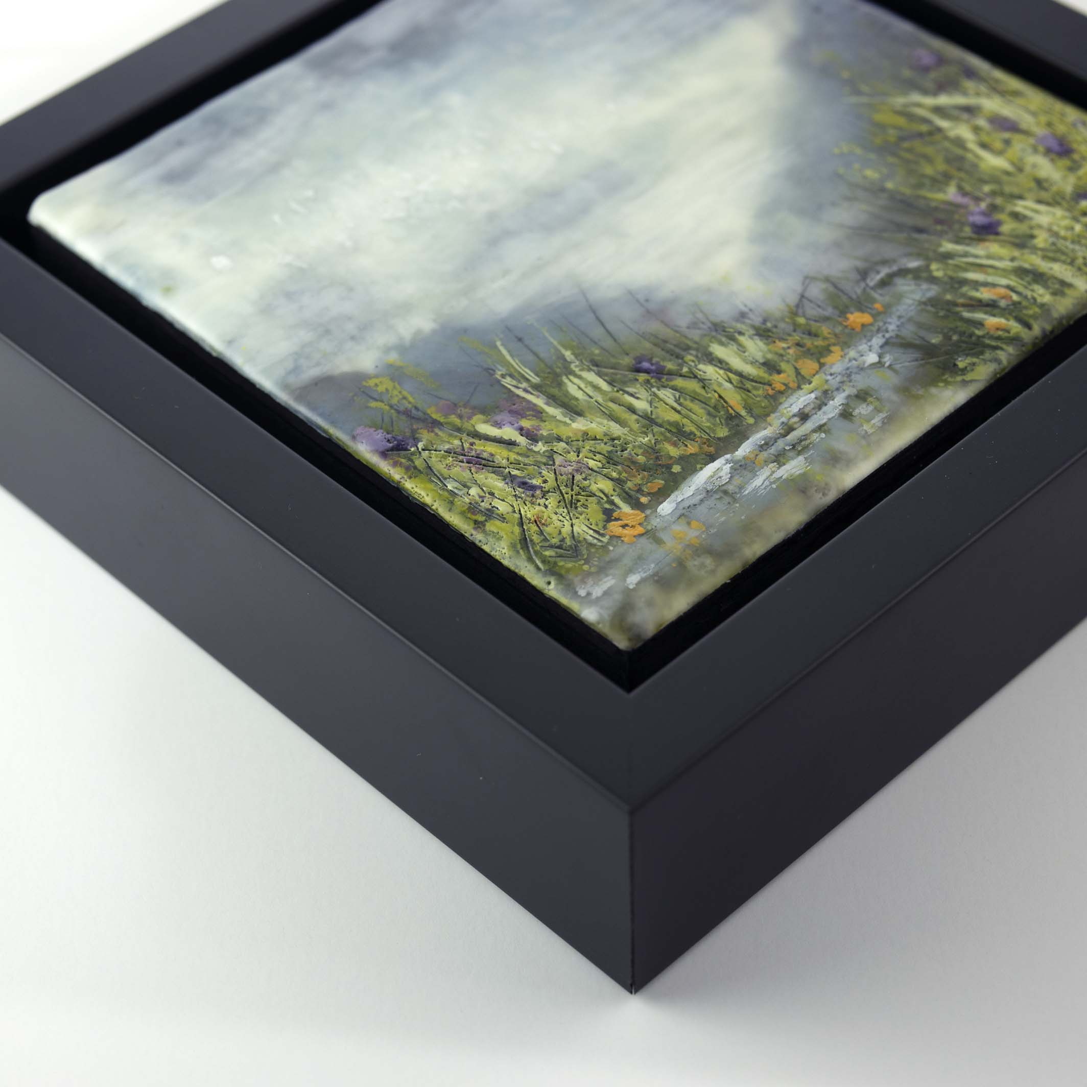 One-of-a-kind, hand-painted encaustic art. Encaustic, oils, on board. The edges and back of the board are a satin black hand finsihed oil rub.
