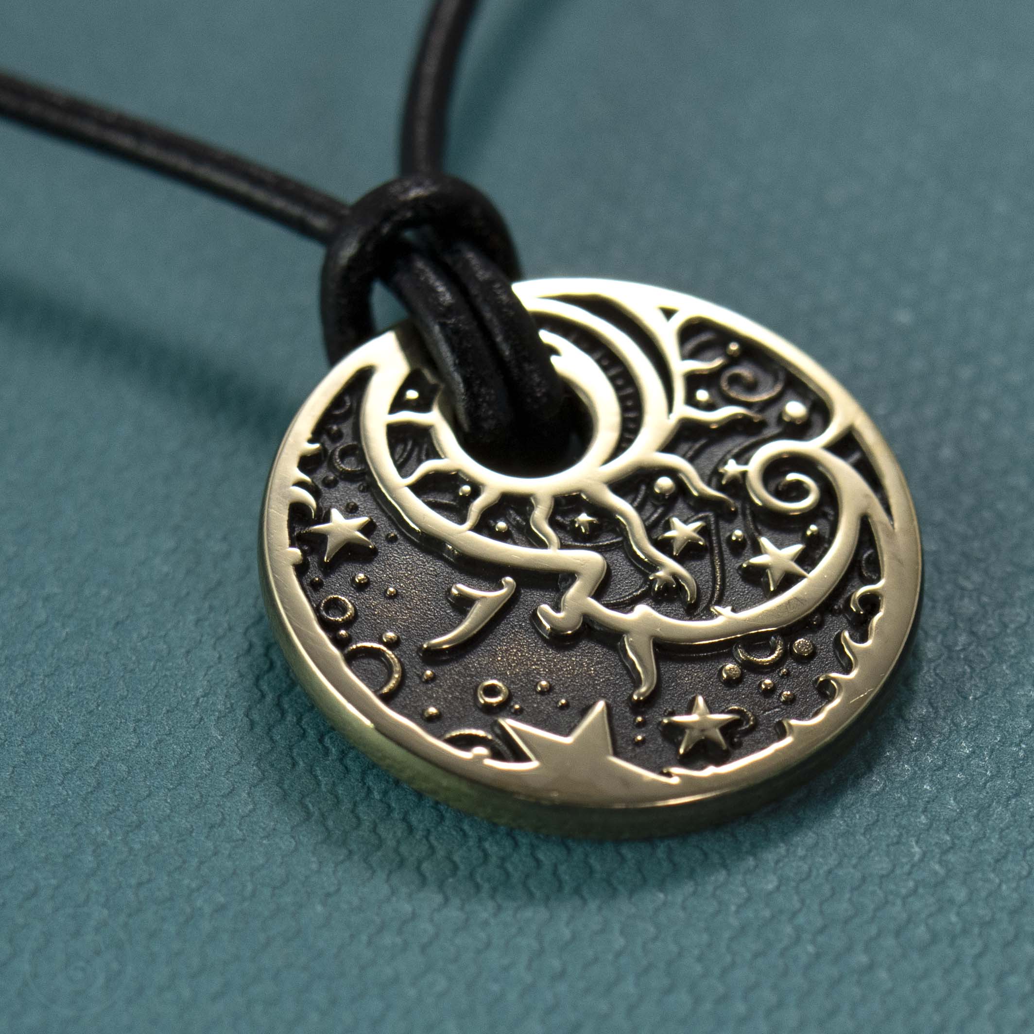 Man in the moon design in deep relief. The back features intricate design.