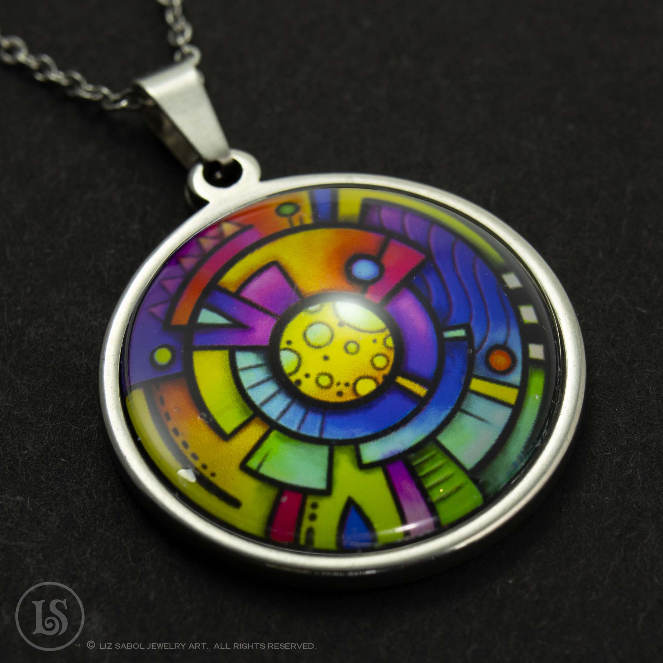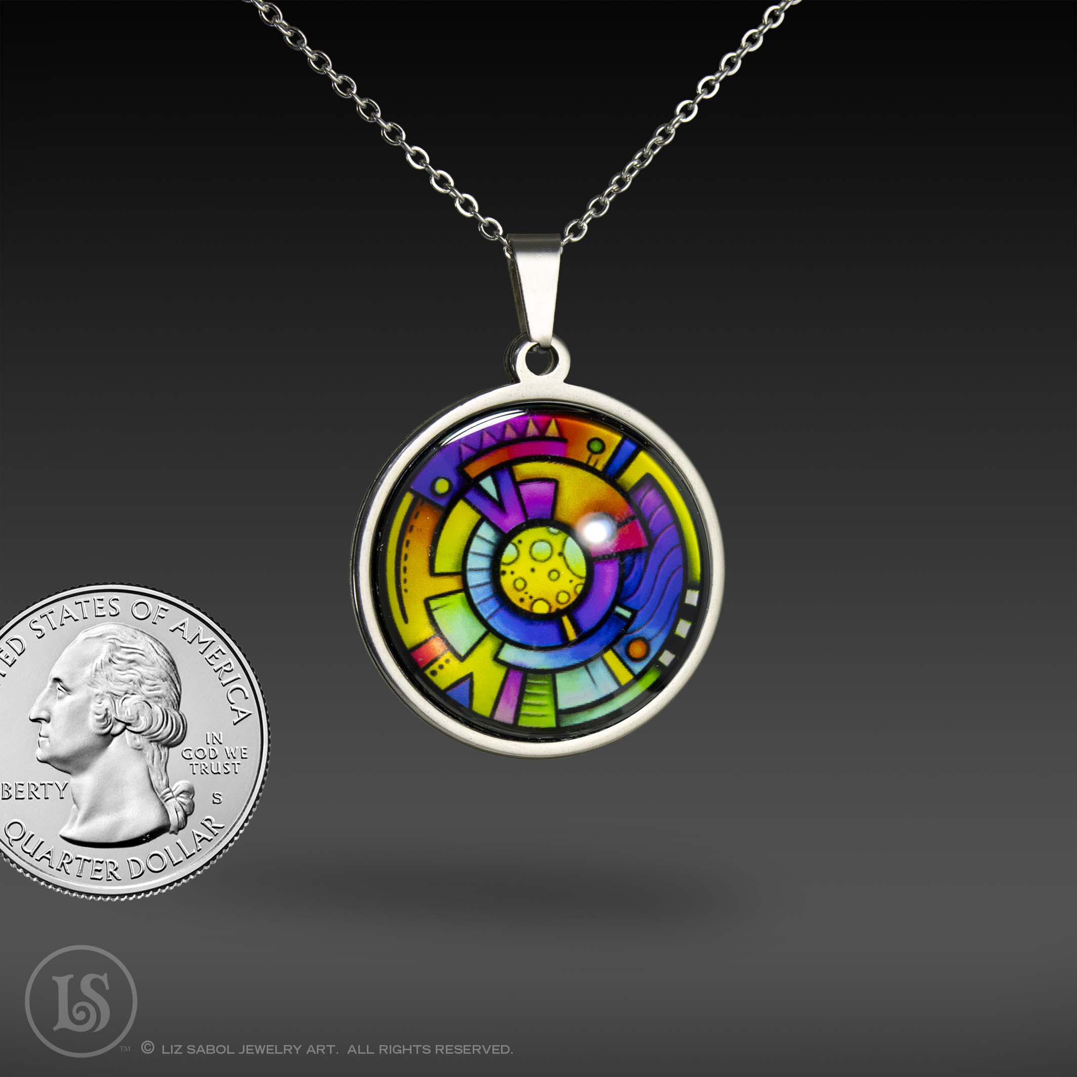 This is a high-quality reproduction in Giclee, archival fine-art print, with vivid color and a mother-of-pearl shimmer, of my colorful abstract illustration #4, mounted on stainless steel and covered in solid glass. Affordable for everyone. Available in silver-tone. Comes with a stainless steel chain.