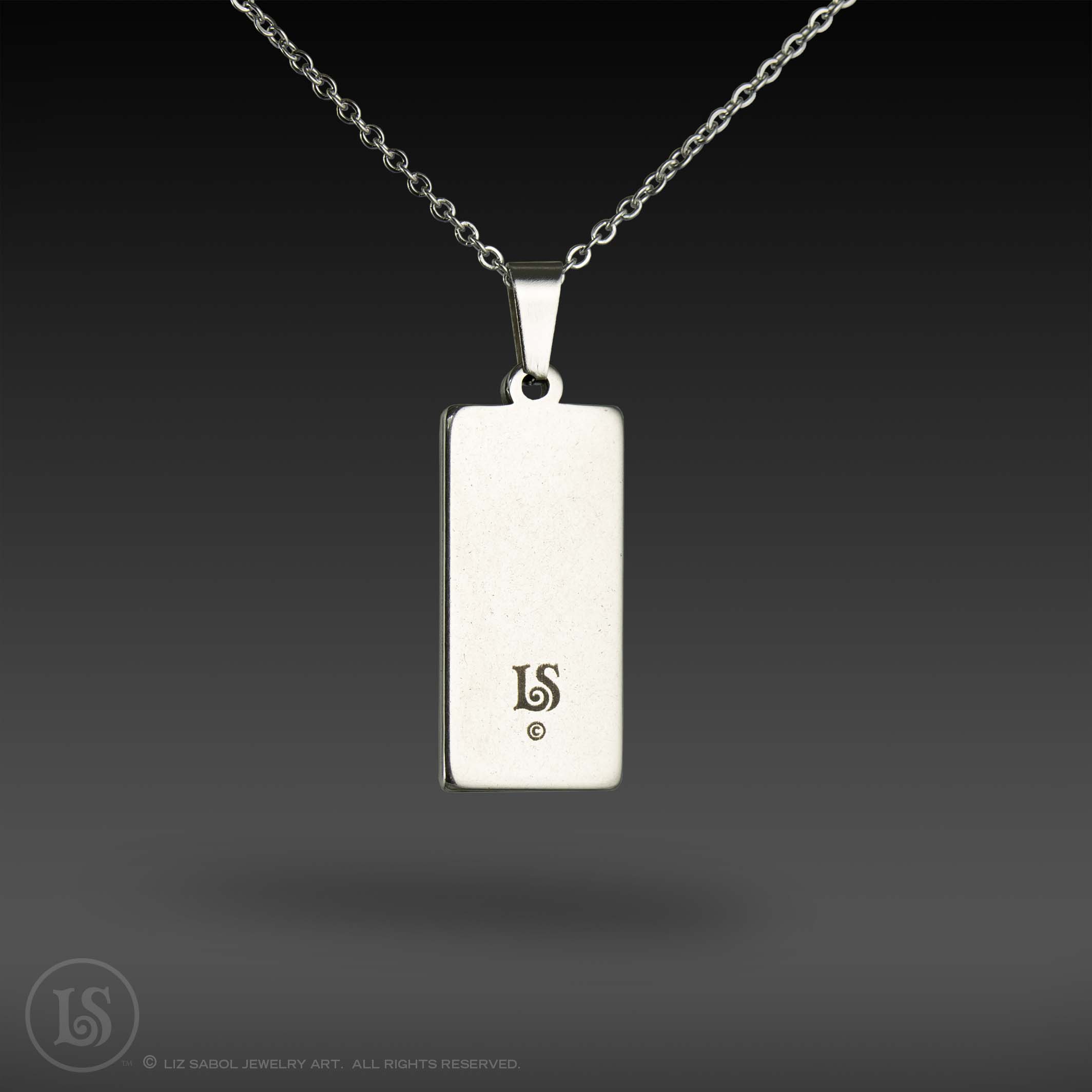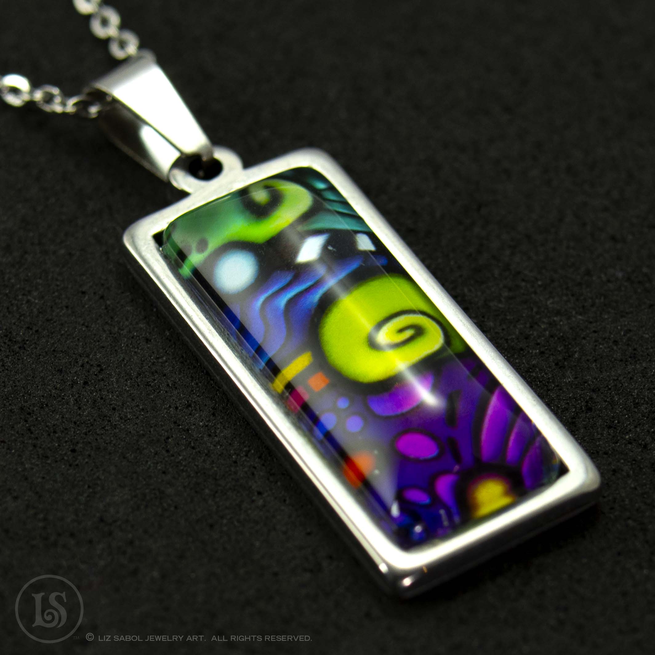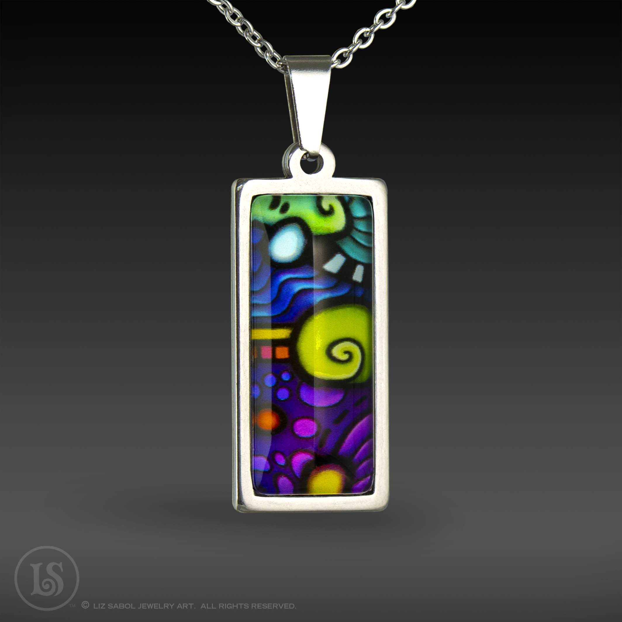 This is a high-quality reproduction in Giclee, archival fine-art print, with vivid color and a mother-of-pearl shimmer, of my colorful abstract illustration #3, mounted on stainless steel and covered in solid glass. Affordable for everyone. Available in silver-tone. Comes with a stainless steel chain.