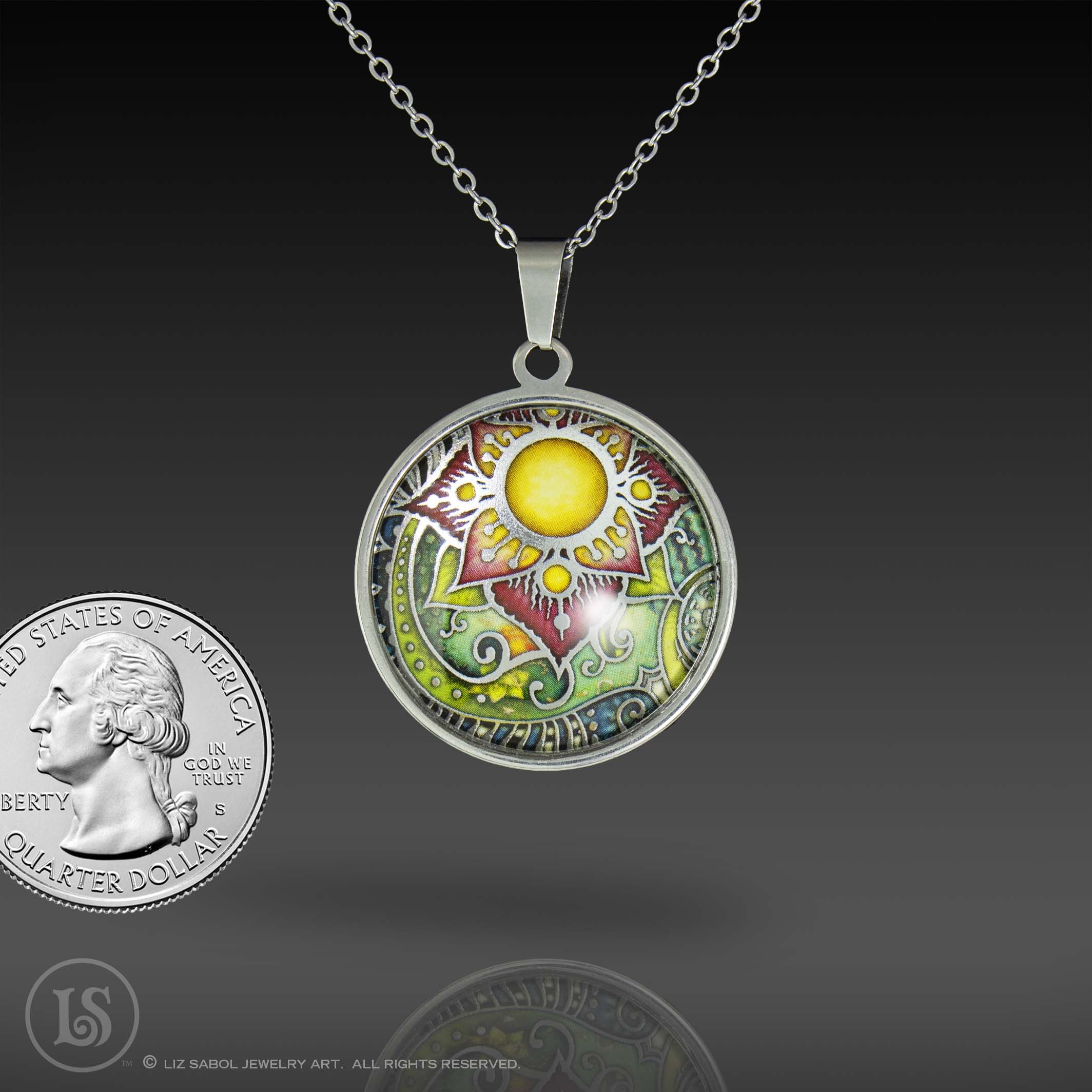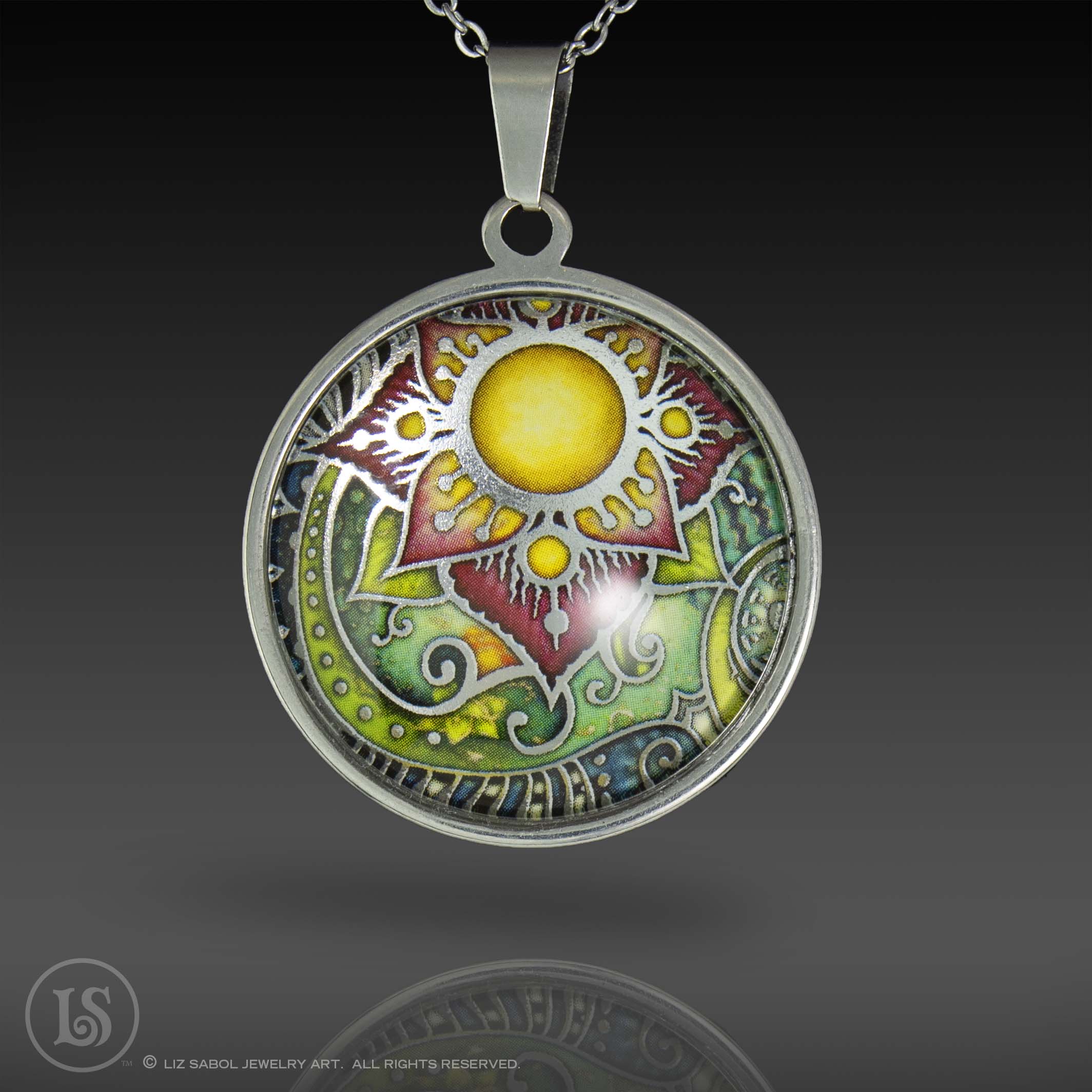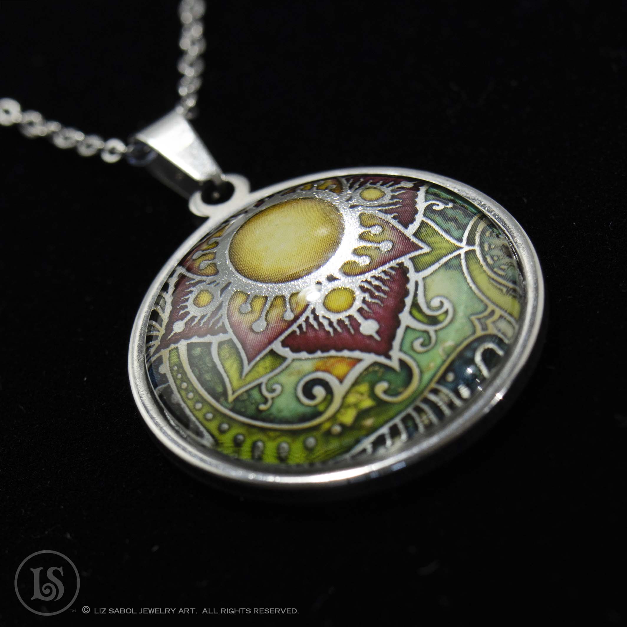 This is a high-quality reproduction in ink and foil of my popular handmade champleve botanical Passion design, mounted on stainless steel and covered in solid glass. Affordable for everyone. Comes with a stainless steel chain.