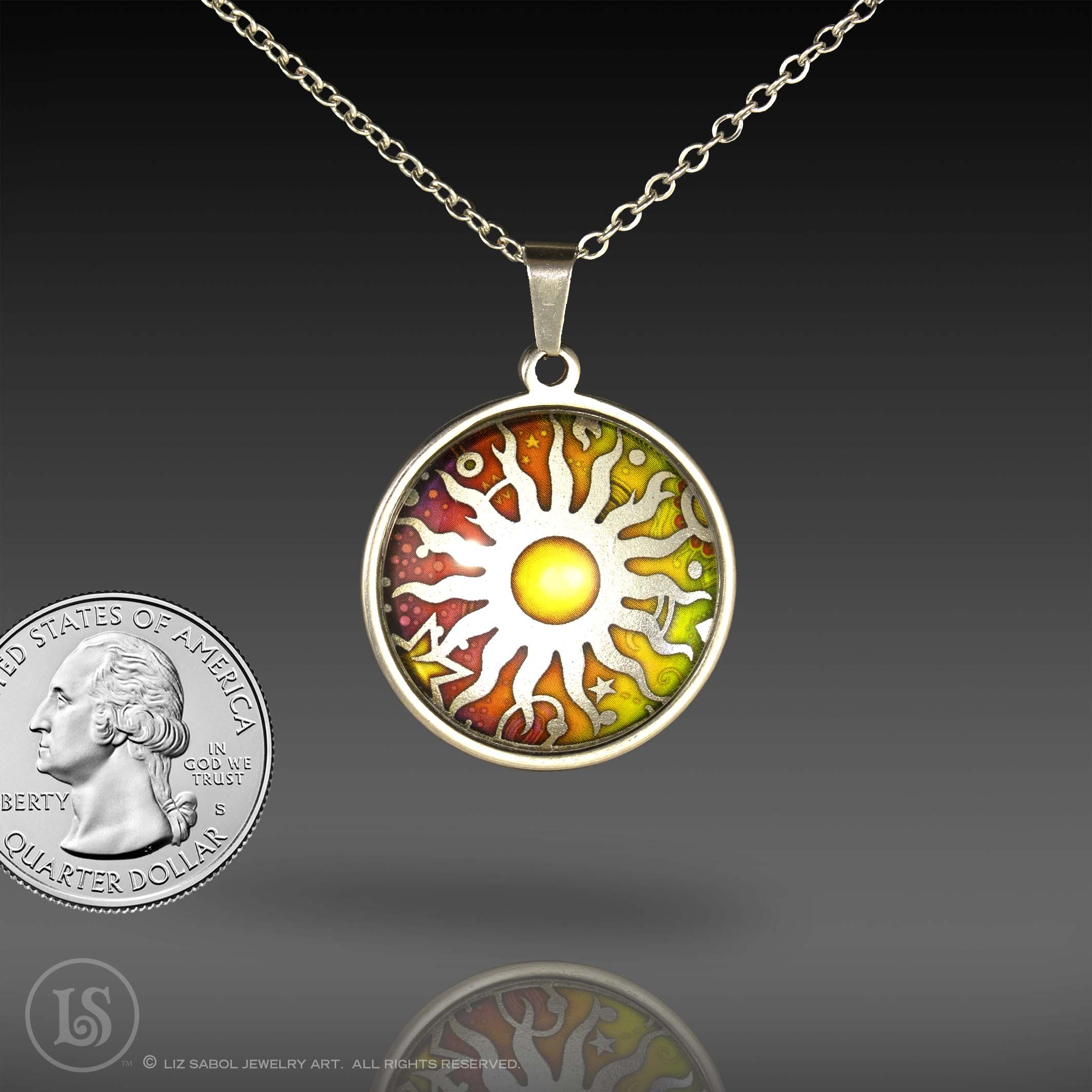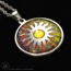 This is a high-quality reproduction in ink and foil of my popular handmade champleve Celestial Sun design, mounted on stainless steel and covered in solid glass. Affordable for everyone. Comes with a stainless steel chain.