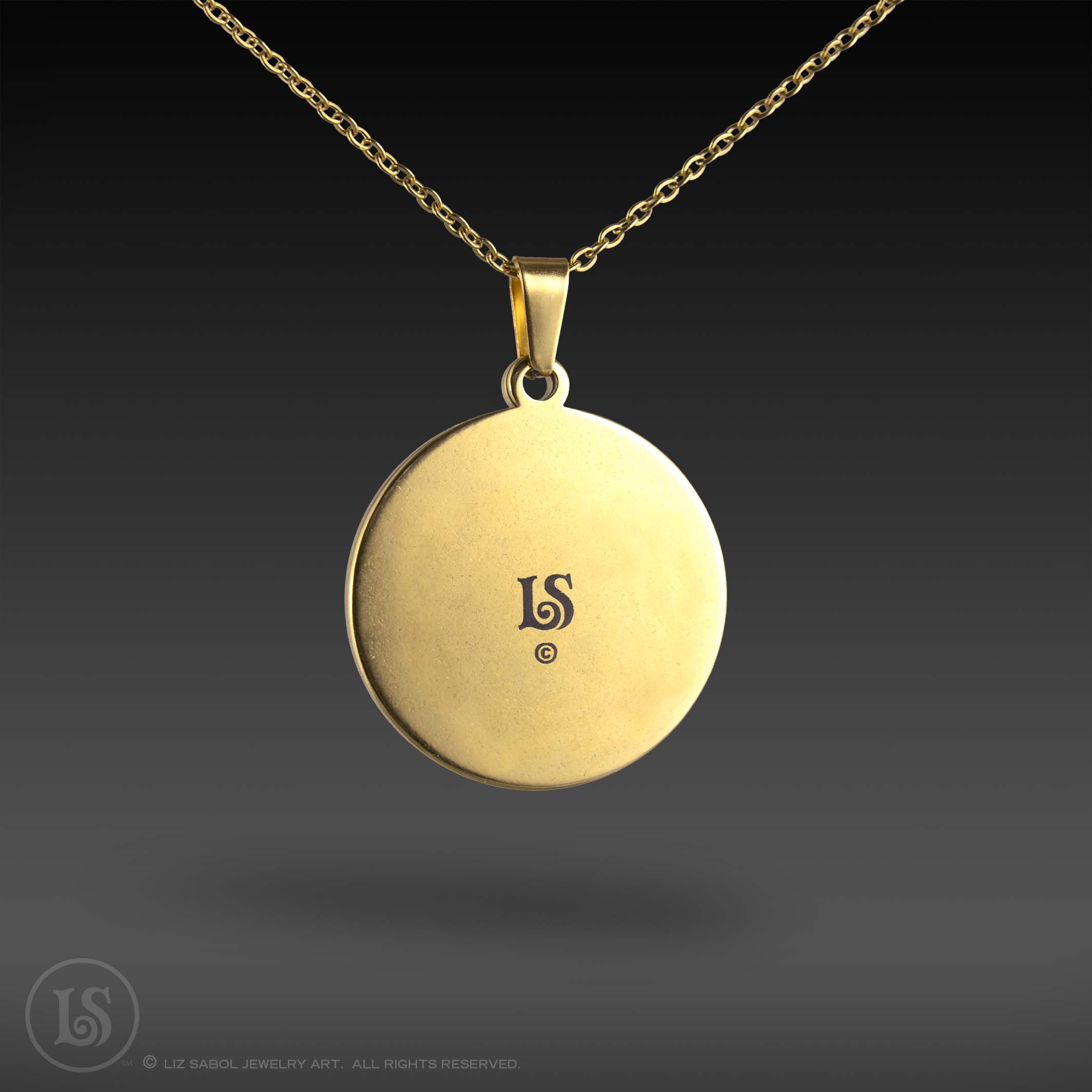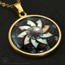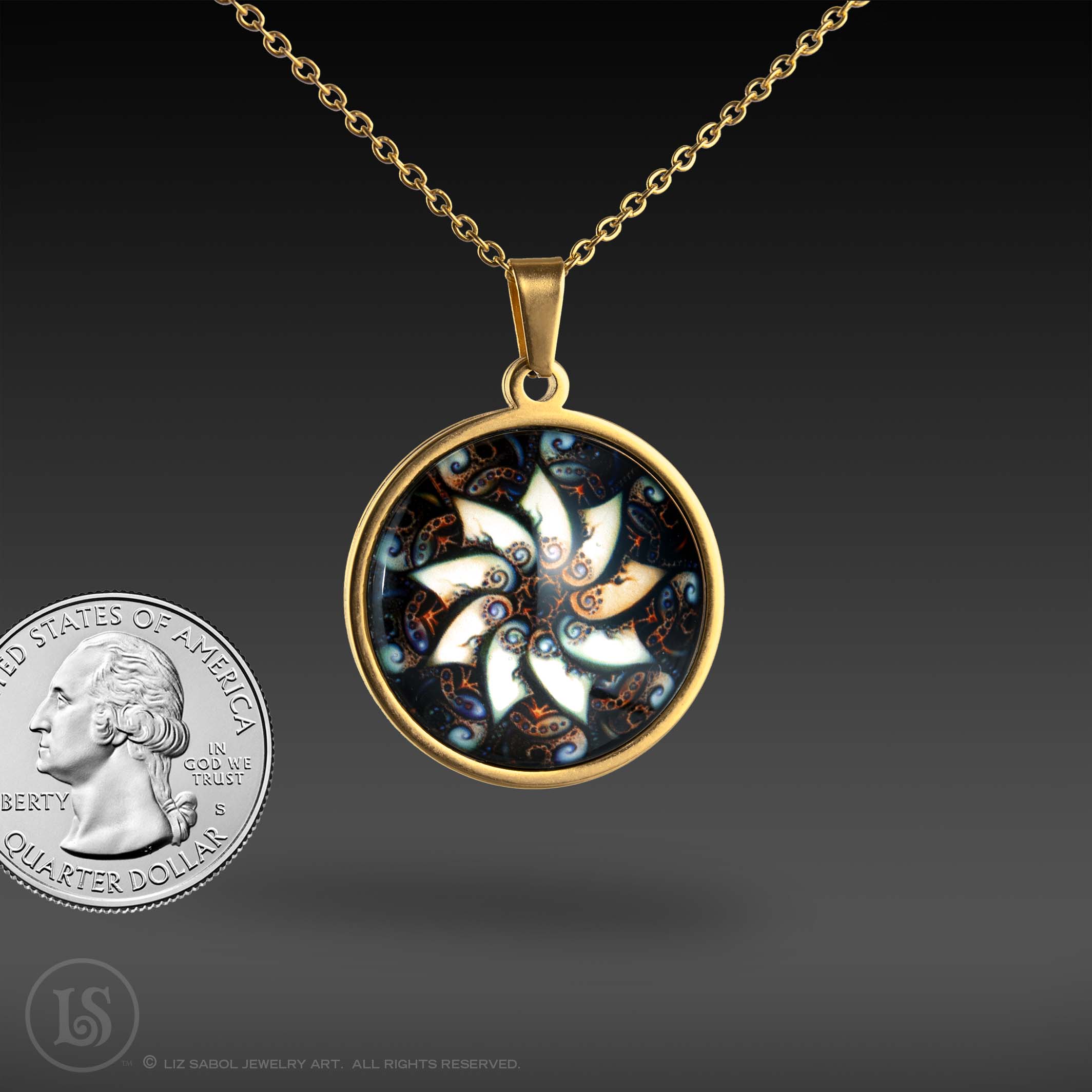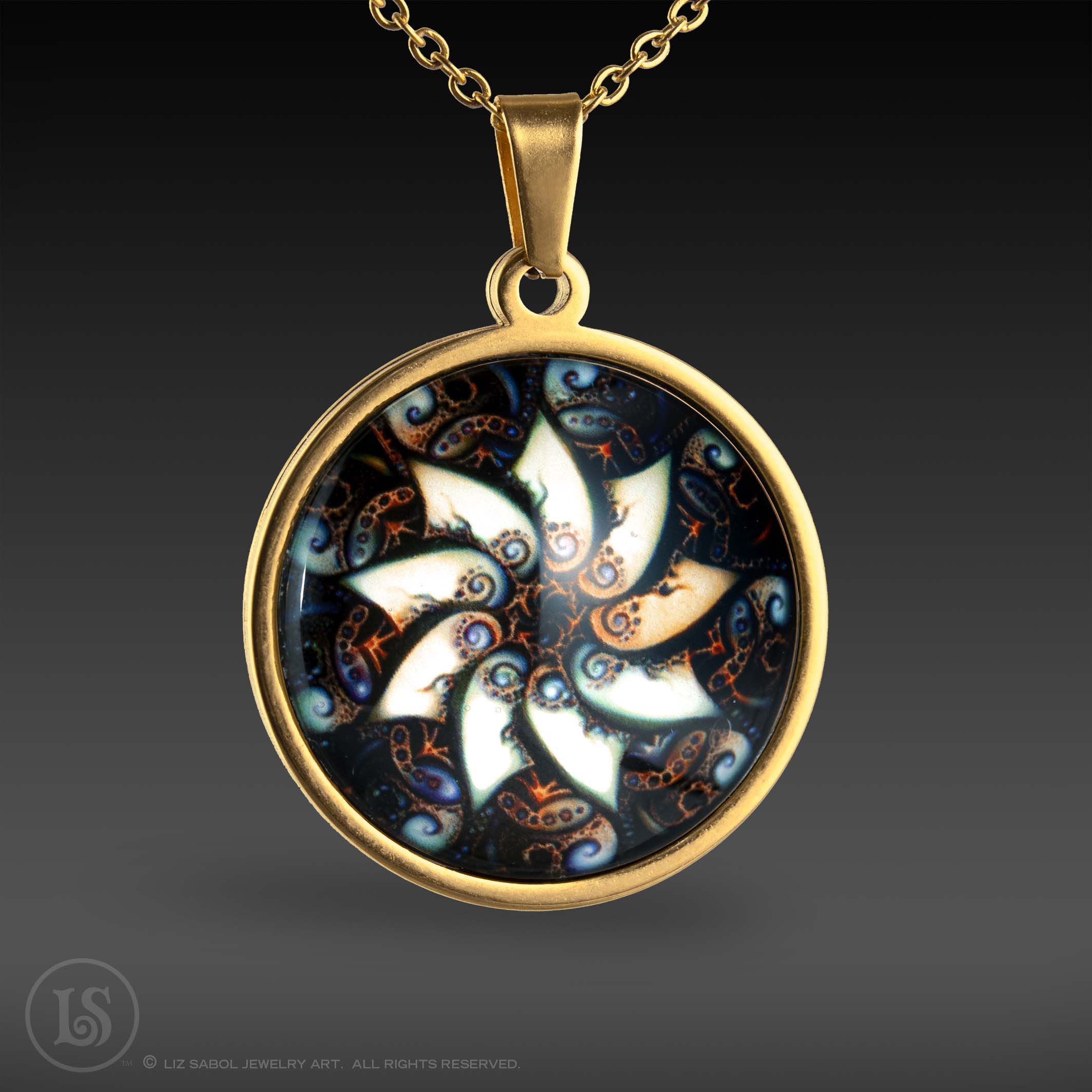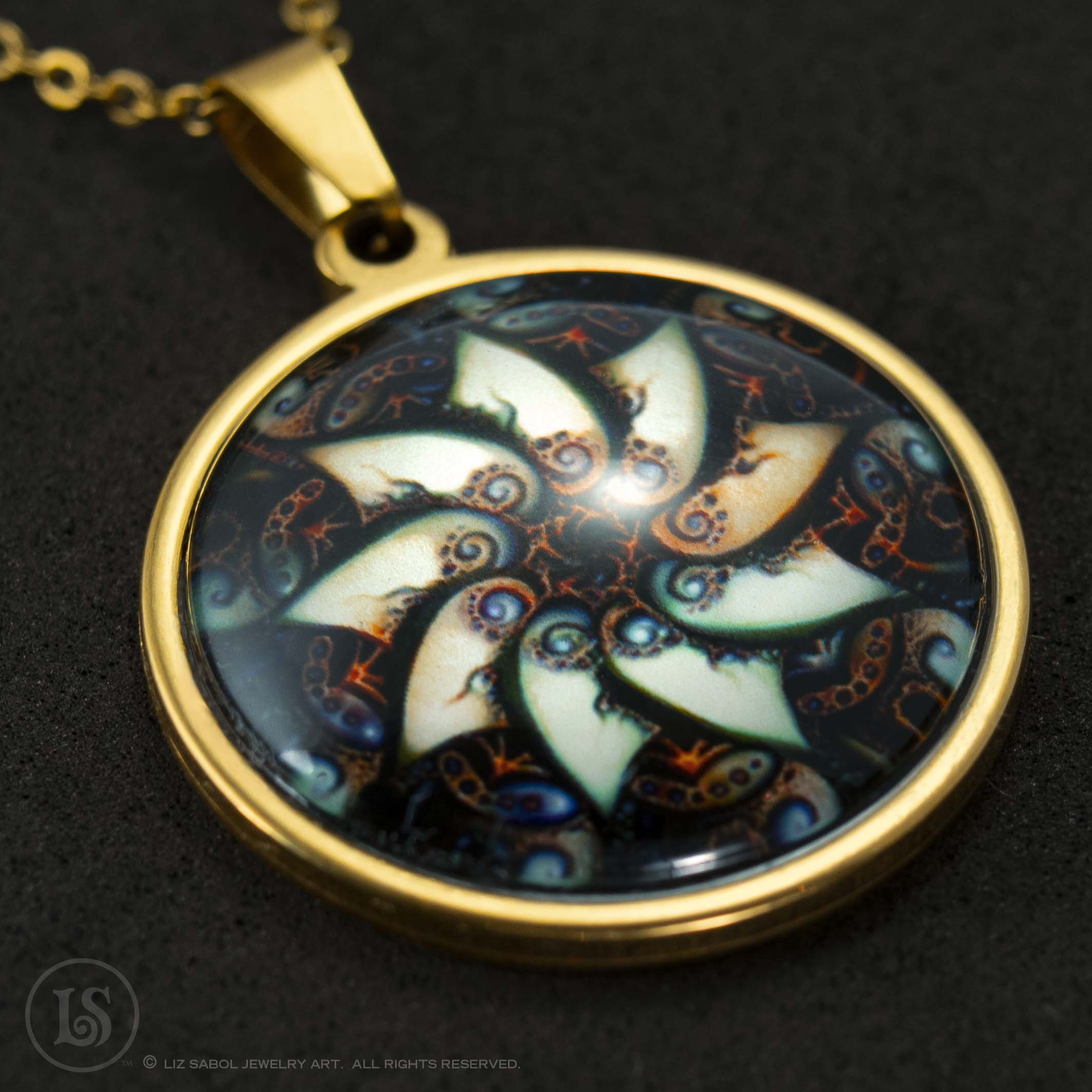 This is a high-quality reproduction in Giclee, archival fine-art print, with a mother-of-pearl shimmer, of my illustration #35 in the Mandala series, enhanced with artificial intelligence/machine learning techniques, mounted on stainless steel and covered in solid glass. Affordable for everyone. Available in gold-plated. Comes with a stainless steel chain.