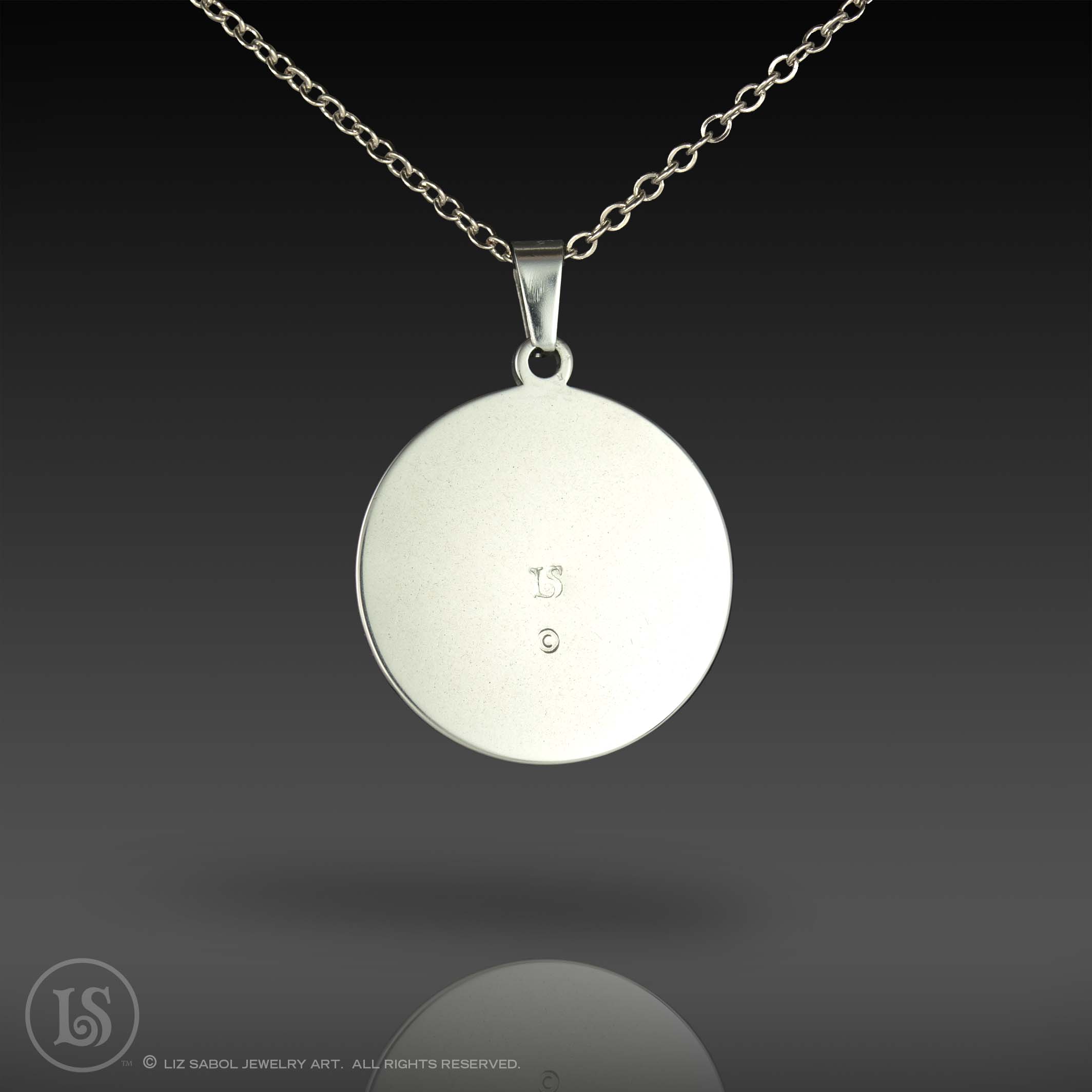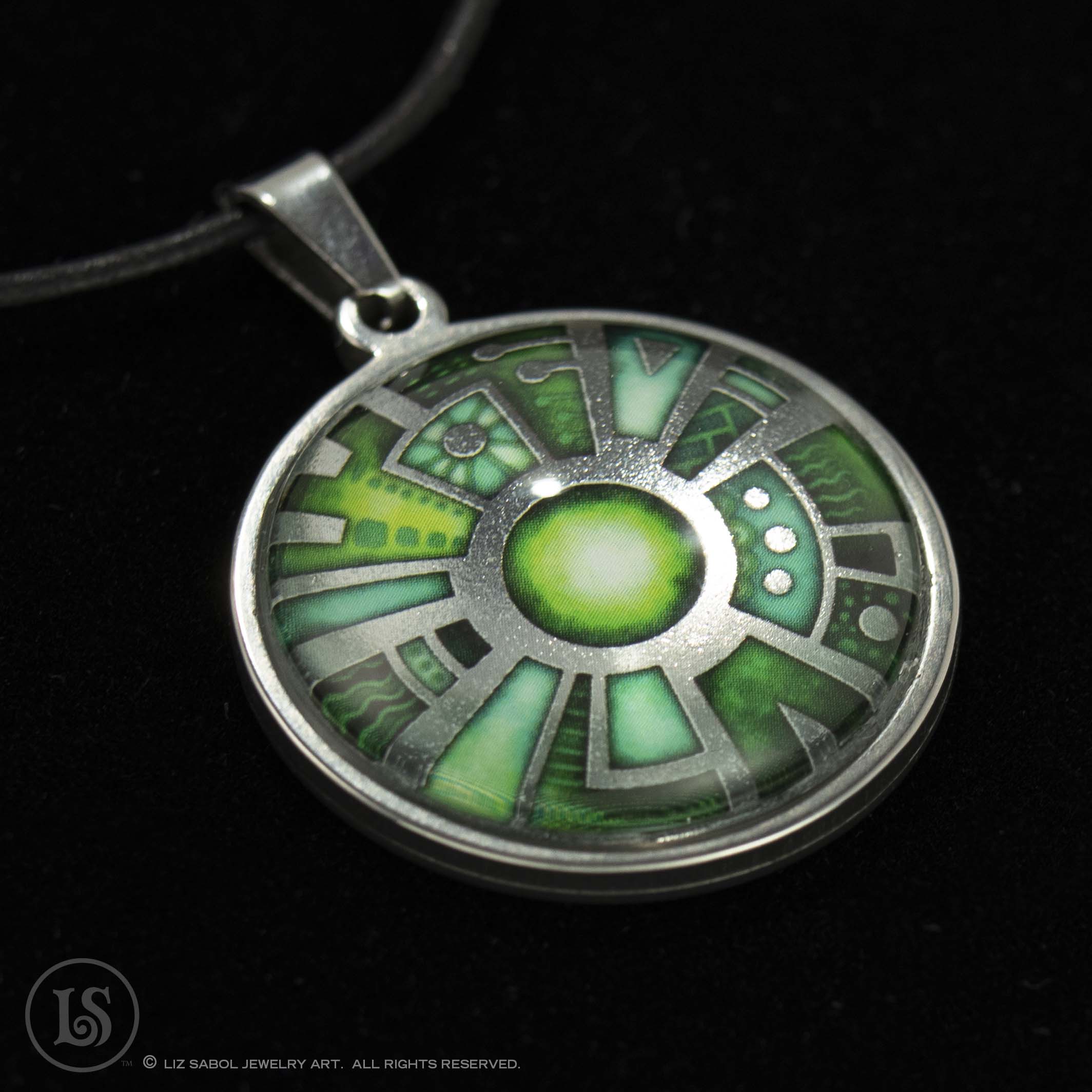 This is a high-quality reproduction in ink and foil of my popular handmade champleve Radial design, mounted on stainless steel and covered in solid glass. Affordable for everyone. Comes with a stainless steel chain.